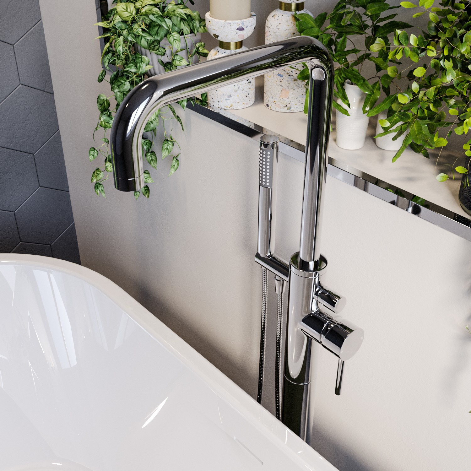 The Lenton freestanding bath tap in chrome can be perfectly paired with our freestanding baths. This freestanding tap is both a bath filler and shower handset, giving you choice with your product. The shower handset allows freedom to move and helps with cleaning, especially with pets! It incorporates a modern design and the highest quality brass for a highly reliable and long-lasting operation. The stylish zinc handle provides a single lever control for on/off operation and temperature control. The electroplated finish strengthens the tap's resistance to rust and corrosion, boosting longevity and endurance.