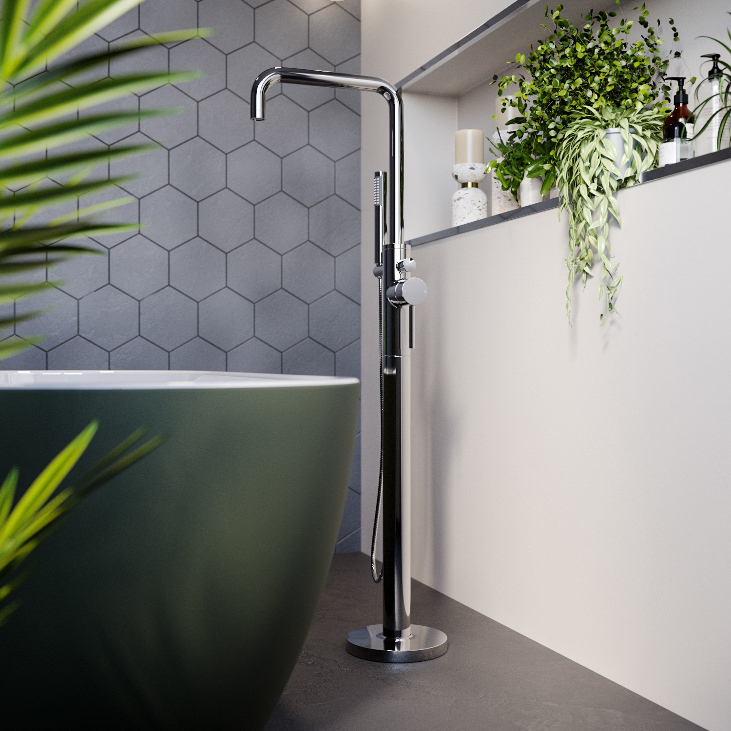 - Stylish freestanding chrome tap, with bath filler and shower handset