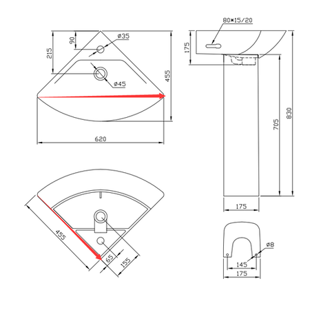 - Sleek corner basin with 1 tap hole and full pedestal