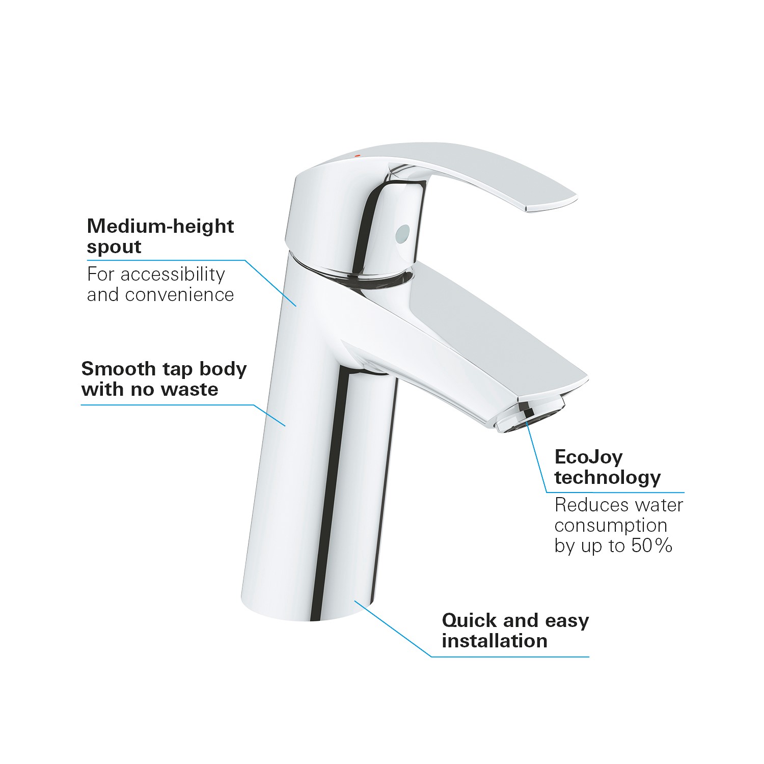 Stylish and built to last, the GROHE Eurosmart basin tap is a versatile bathroom tap you can trust. It has a medium high spout and an elegant smooth body with no waste. Its cutting edge ceramic cartridge allows you to control water temperature and flow with smooth precision. The scratch resistant GROHE StarLight chrome coating is easy to clean and has a sparkle that will last for years. And with GROHE EcoJoy technology, water usage is cut by 50 per cent without a drop in performance. GROHE Eurosmart – blending timeless style and performance for the pure enjoyment of water.