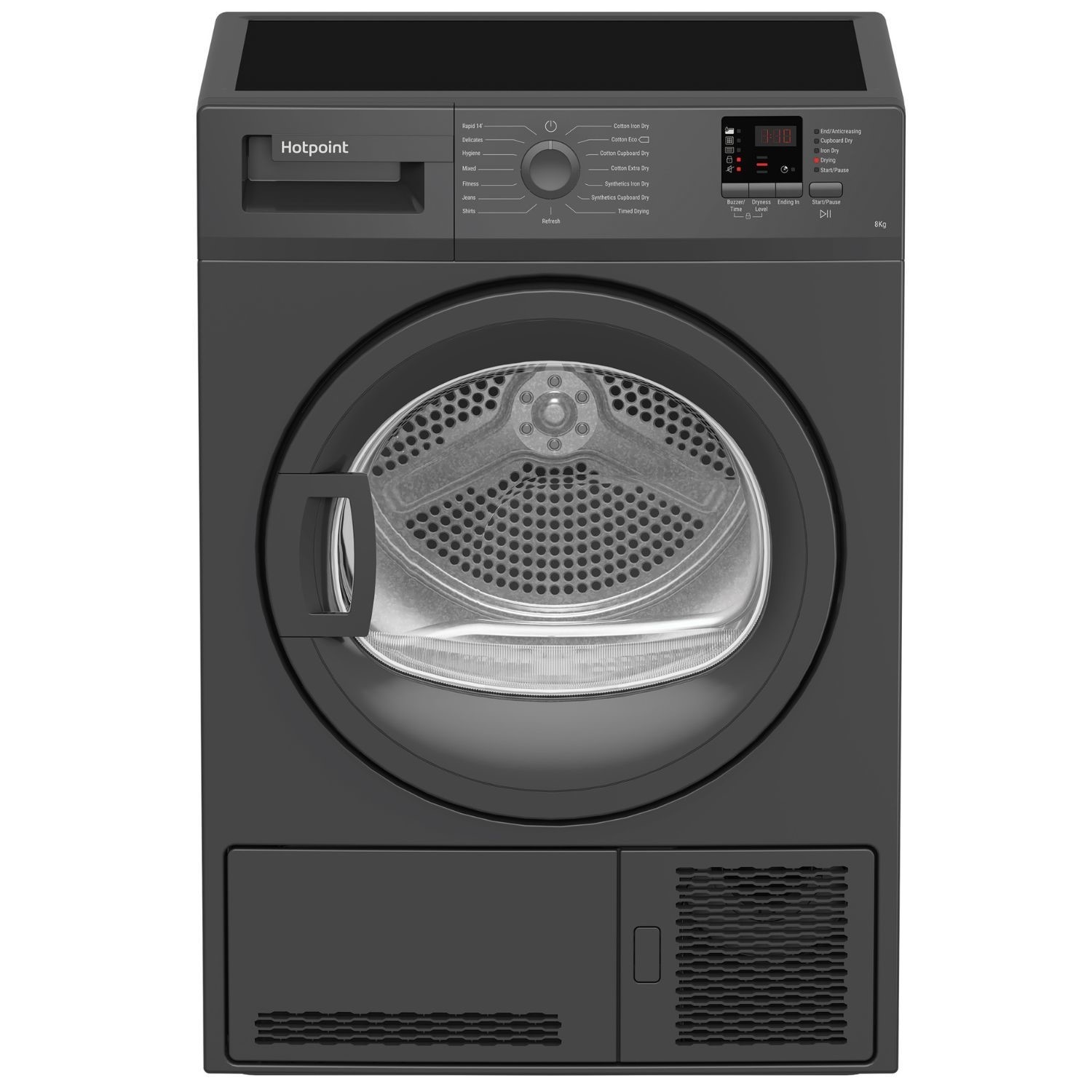The Hotpoint CHDC82GGGDUK condenser tumble dryer combines style and performance, featuring a sleek graphite grey finish and a spacious 8kg capacity, ideal for busy households. With 15 drying programmes, including Mixed, Delicates, Fitness, and Timed Drying, it ensures your clothes receive the right care every time. Sensor drying technology automatically detects moisture levels and stops the cycle when your laundry reaches the perfect dryness, preventing over-drying while saving energy. Plus, the anti-creasing function gently rotates clothes to minimise wrinkles, so you spend less time ironing.