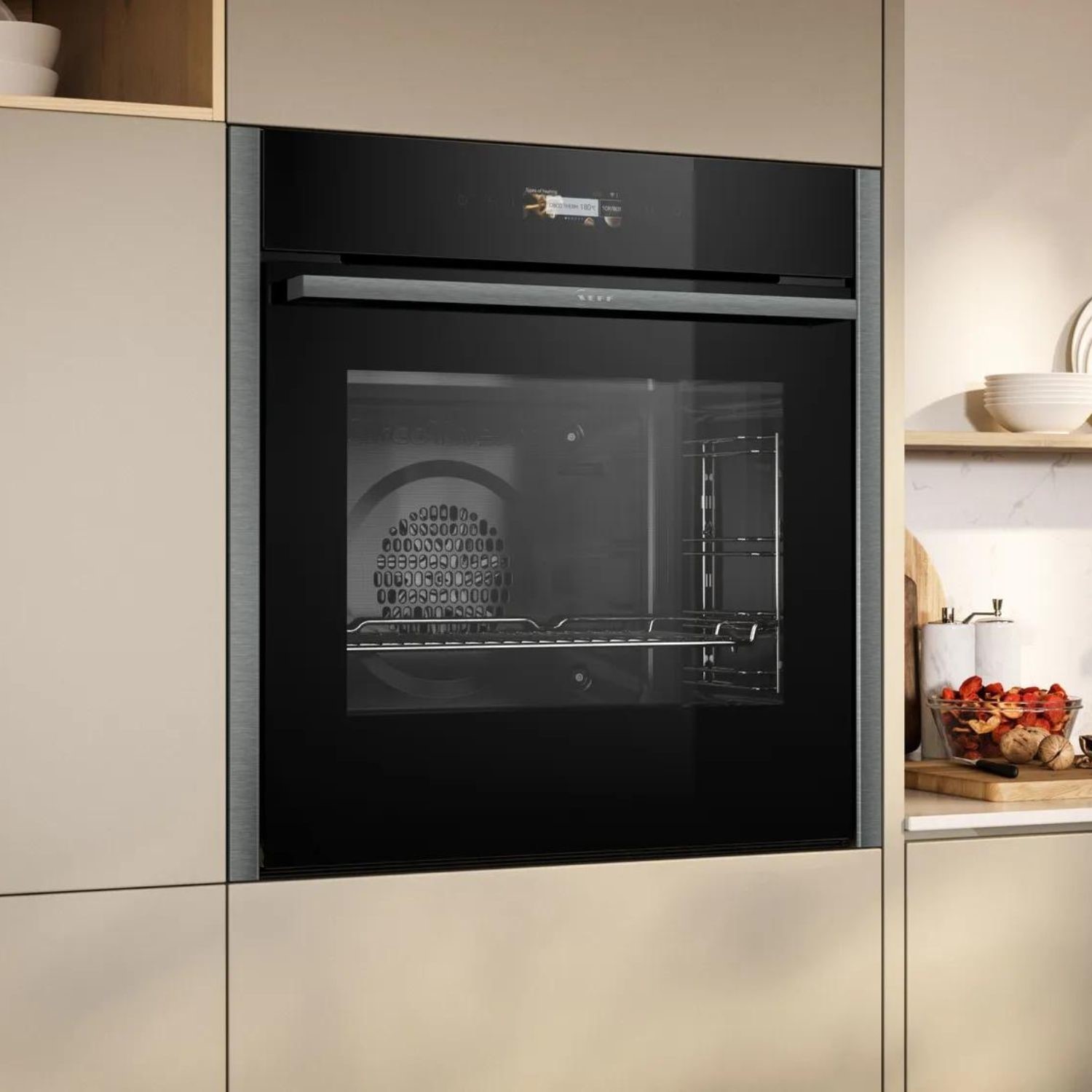Upgrade your kitchen with the NEFF N70 Oven, a sophisticated addition to any modern culinary space. This graphite-grey oven combines cutting-edge technology with sleek design, offering a range of features that elevate your cooking experience.