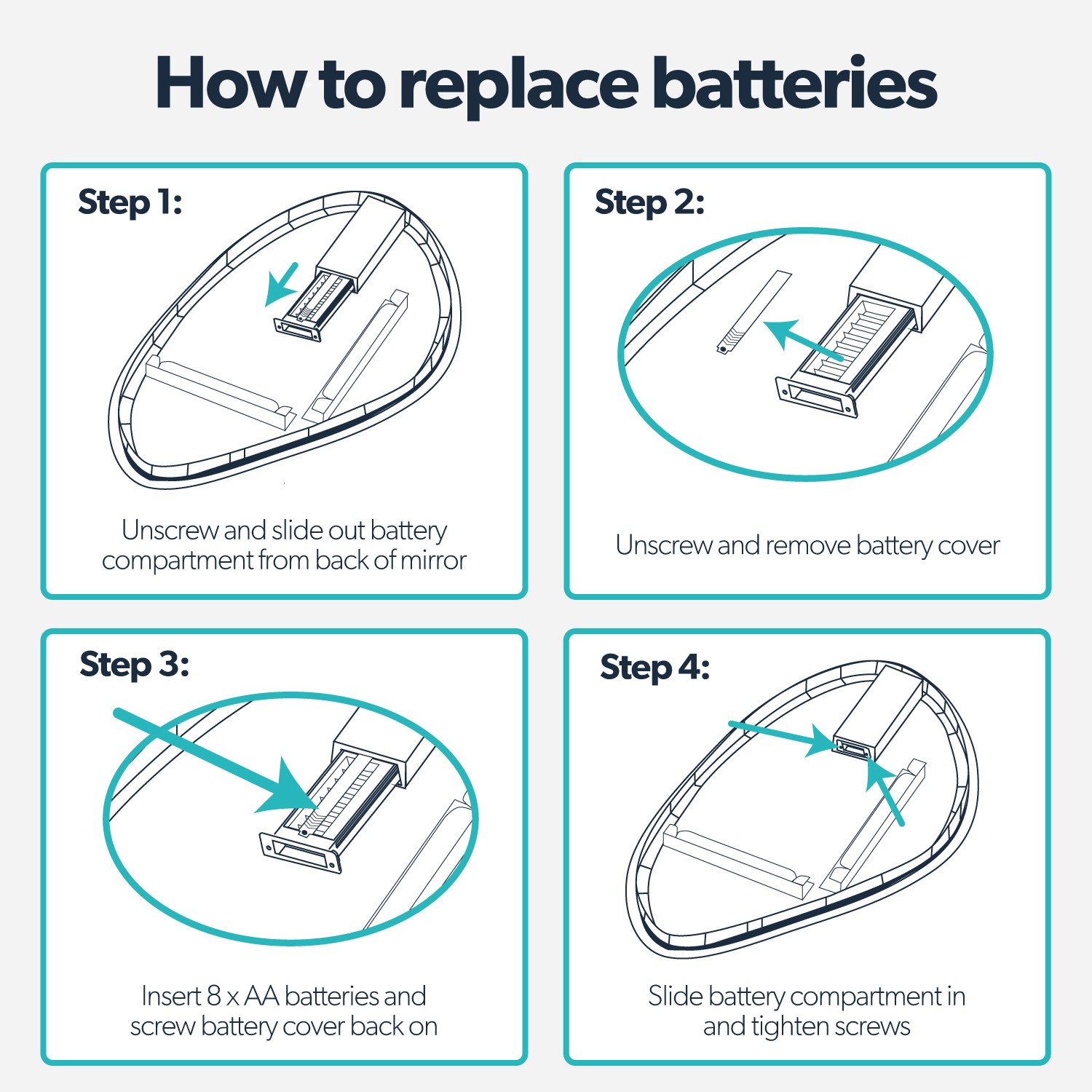 The battery box is located on the back of the mirror. On top of the battery compartment is a cover, remove the cover then add 8 xAA batteries (not included) into the battery compartment, then reattach the cover back on. The convenient rocker switch at the bottom of the mirror when mounted in portrait orientation controls the backlit illumination. This IP44-rated mirror is completely safe for bathroom use. For optimal performance, we recommend using high- capacity alkaline batteries. Using lower capacity batteries may reduce brightness and shorten battery life.