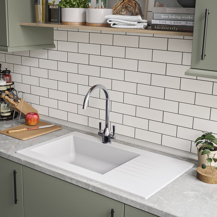 The sleek, reversible design makes this composite sink the perfect addition to your home; the bright white finish will make a pop in any kitchen. There’s a pre-drilled tap hole on each side, simply choose which side you’d like your tap and knock out the tap hole. It comes complete with a chrome basket strainer waste. The sink is scratch, stain and heat resistant, whilst also being easy to maintain and clean with its smooth finish. The composite resin material is durable but also will be less harsh to your dishware than a standard granite sink, meaning less breakages.