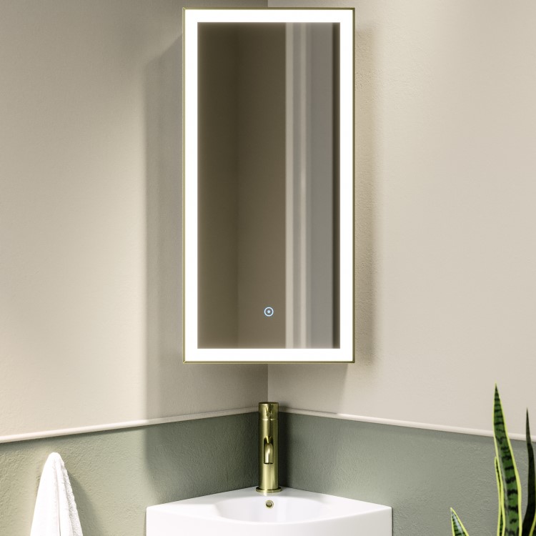 Transform your corner space into a functional storage solution with this elegant Lykos LED mirror cabinet. The clever corner design making brilliant use of often-wasted space. The sophisticated matt white body with brushed brass frame complements contemporary bathroom schemes, whilst the mirrored surfaces help smaller spaces feel more open and bright.