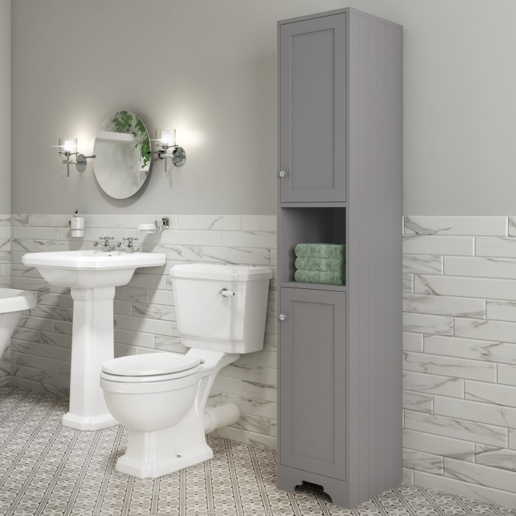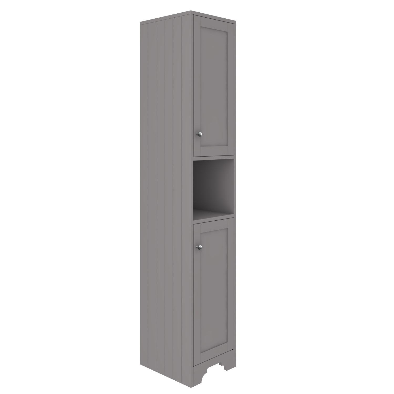 Update your bathroom with this tall Baxenden storage unit. Characterised by a classic tongue-and-groove side panelling, the ornate front skirting and a matt grey finish, it has that traditional meets modern styling that'll look great in any style of bathroom. Two cupboard doors, each with a stylish metal button handle opens to reveal six internal shelves in total and provide generous storage space for all your bathroom essentials and more. There're even soft-closing hinges to prevent them slamming, providing a quieter closure. The open storage is ideal for display. It matches a wide range of other Baxenden products to complete the perfect look.