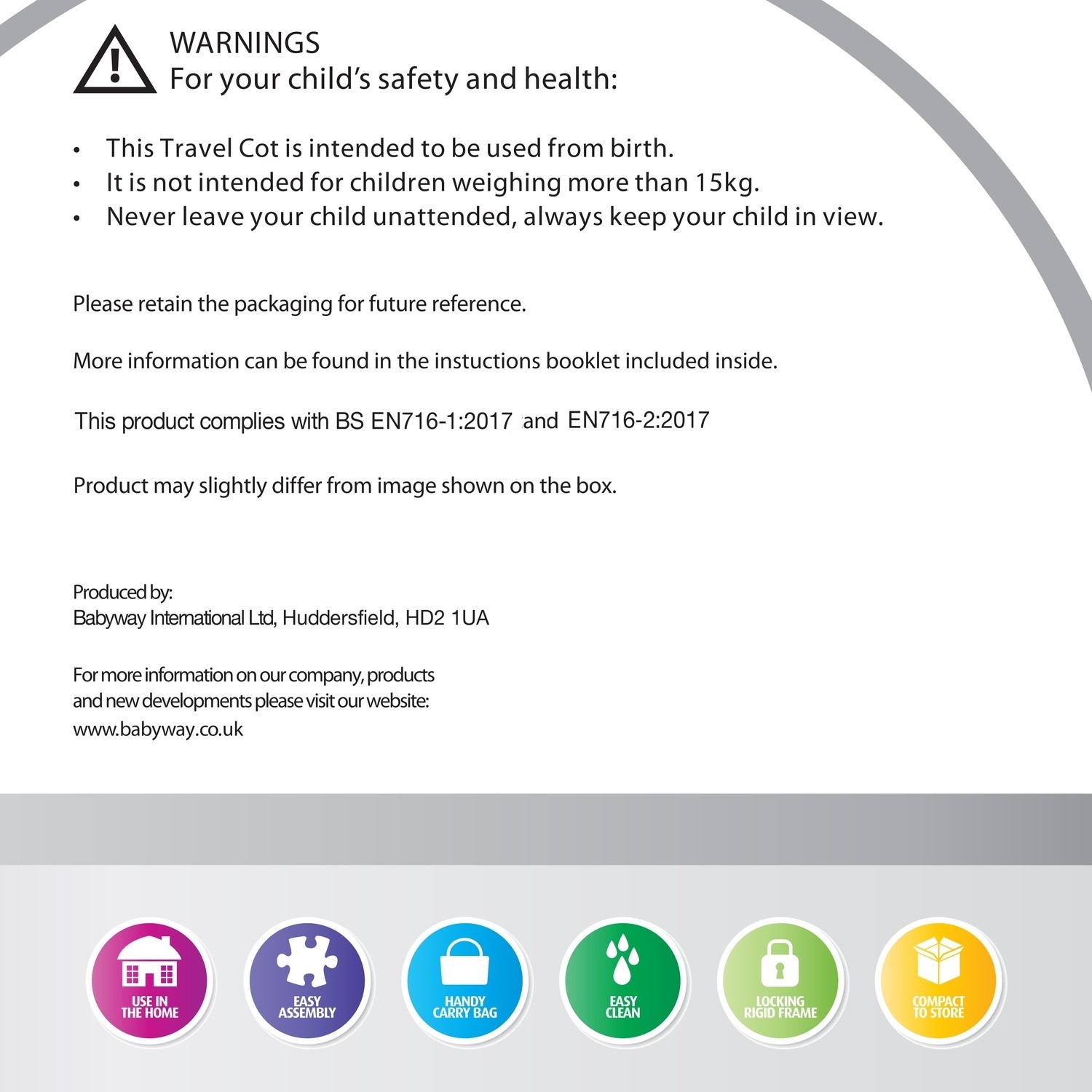 Create a cosy and comfortable place for your baby to rest when you’re away from home with this Babyway Classic Travel Cot. It makes an ideal playpen too, giving your baby a safe area to play. It features fully padded top rails to ensure safety and comfort when lifting your little one in and out, and rest assured, the breathable mesh fabric side panels enable you to keep an eye on them and vice versa.
