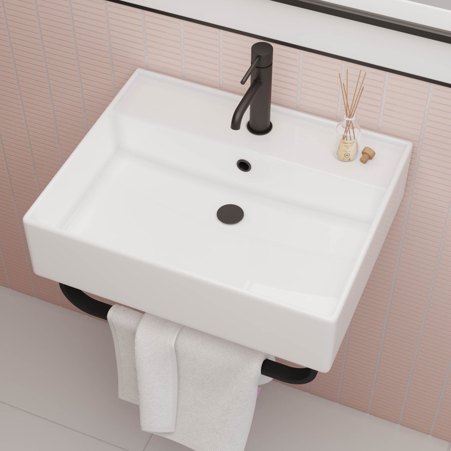 Enhance your bathroom with this gloss white square basin. This basin is the perfect versatile addition to your bathroom. This comes with a matt black towel rail so this basin is perfect for mounting on the wall and then hanging towels from the rail underneath.