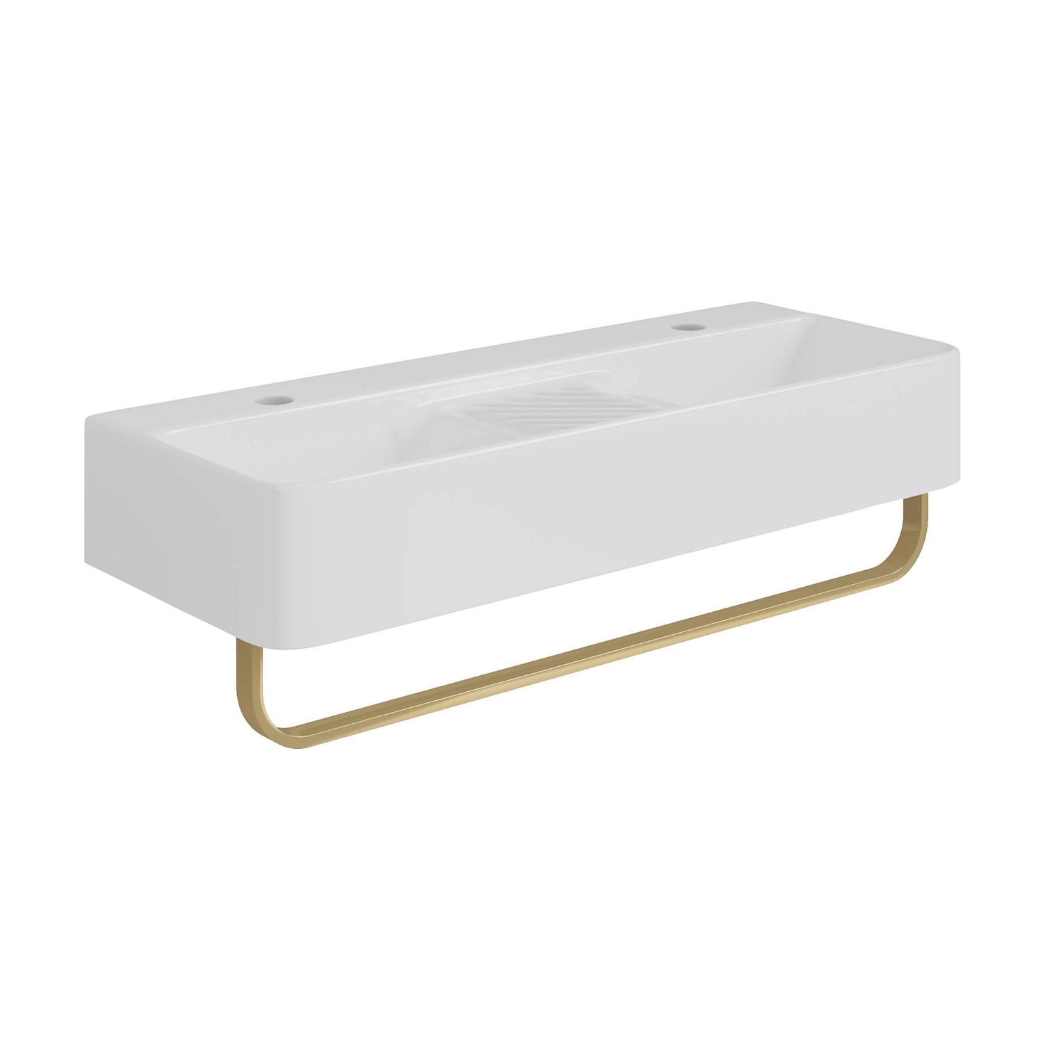 Enhance your bathroom with this double gloss white square basin. This basin is the perfect versatile addition. This comes with a brushed brass towel rail so this basin is perfect for mounting on the wall and then hanging towels from the rail underneath.