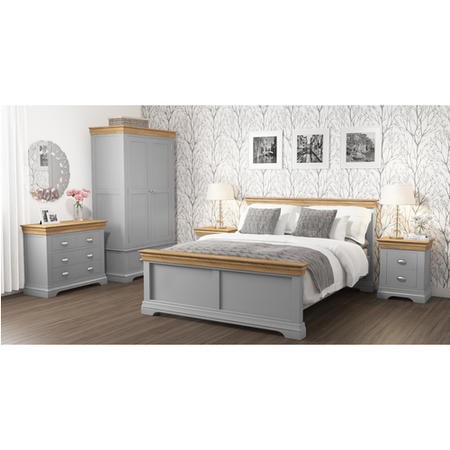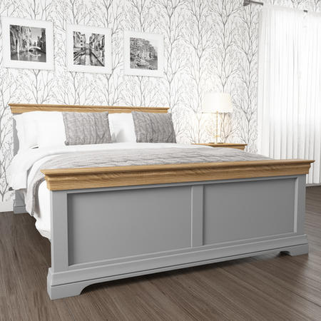 Carefully crafted the Loire King size bed delivers style, practicality and durability. The distinctive two-tone design has been made from solid acacia wood with a soft grey, painted finish and contrasting, solid oak with real oak veneer finishes for enhanced durability.