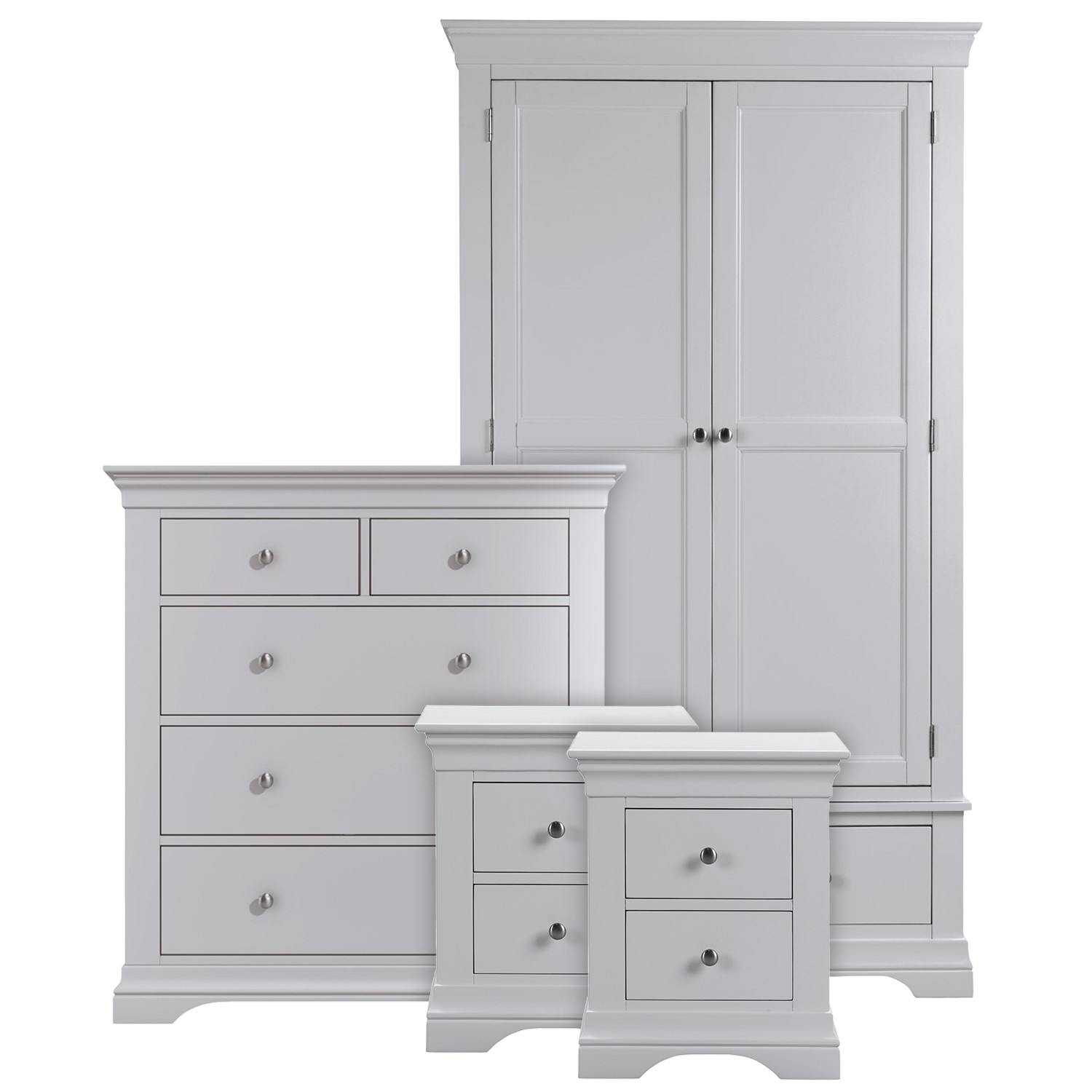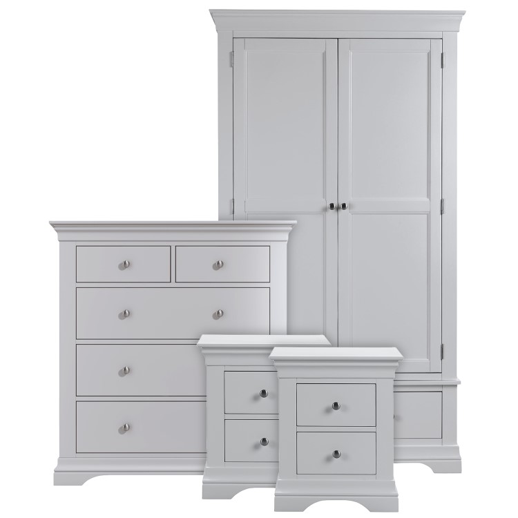 Give your bedroom an elegant French-inspired update with this complete bedroom furniture set. With cornice-style tops, shaped bottoms, and shaker-style fronts on the wardrobe, it'll suit any interior scheme. There's ample space to store folded items and accessories within the chest and bedside tables. The wardrobe has a full width hanging rail and a drawer for extra storage, plus there's plenty of space to add your own storage solution.