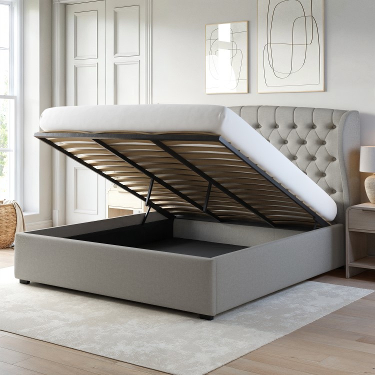Make a stunning statement in your bedroom with this Safina wingback ottoman bed frame with an elegant Chesterfield-inspired design. It includes a tall, modern headboard with deep button detailing, perfect for propping up and relaxing. It's space-saving too, thanks to the ottoman design, which means you can store anything from bedding to towels. You'll soon be clutter-free. Made with a strong wooden frame, it's been built to last. It fits any UK standard super-king mattress, which isn't included giving you the option to choose one that's perfect for you; check out our package deals below.