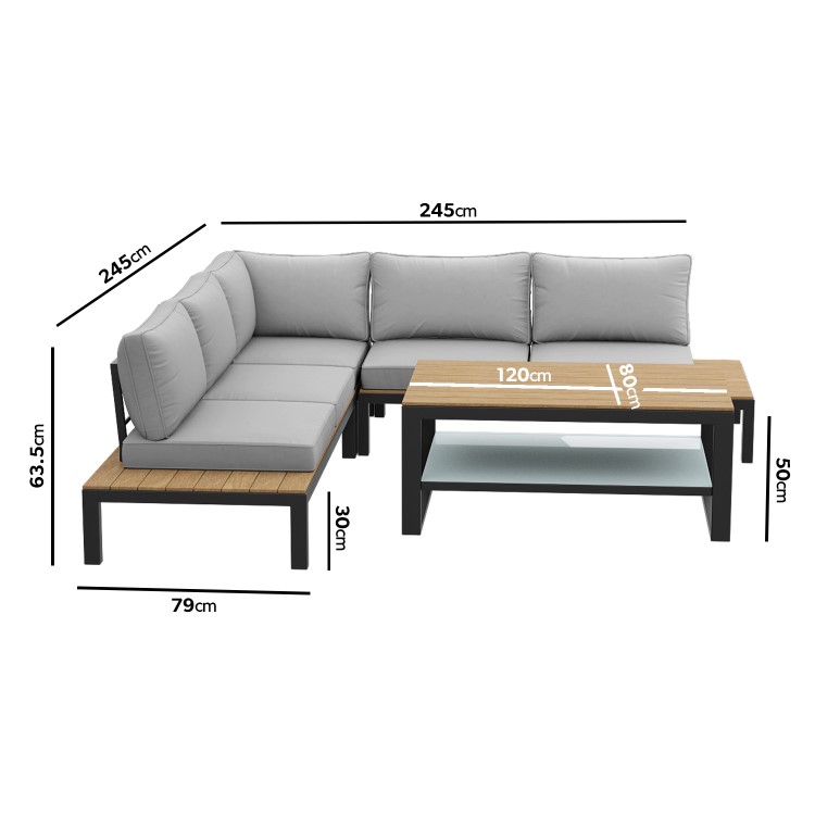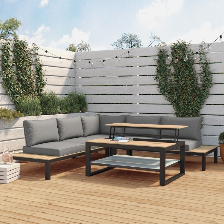 Make a statement in your outdoor space with this corner sofa set. Perfect for entertaining into the late summer evenings with friends and family. Thick deep filled cushions sit around the entire corner sofa, with the ends left free to place a beverage or two. Accompanied by a matching table, which features a Polywood slat top that lifts with a simple mechanism, bringing it closer to you, and a practical shelf beneath, it's excellent for alfresco dining. The aluminium frame is weatherproof and waterproof. The cushion covers can be removed, and machine washed to be kept fresh. It's the ideal all-year-round set.