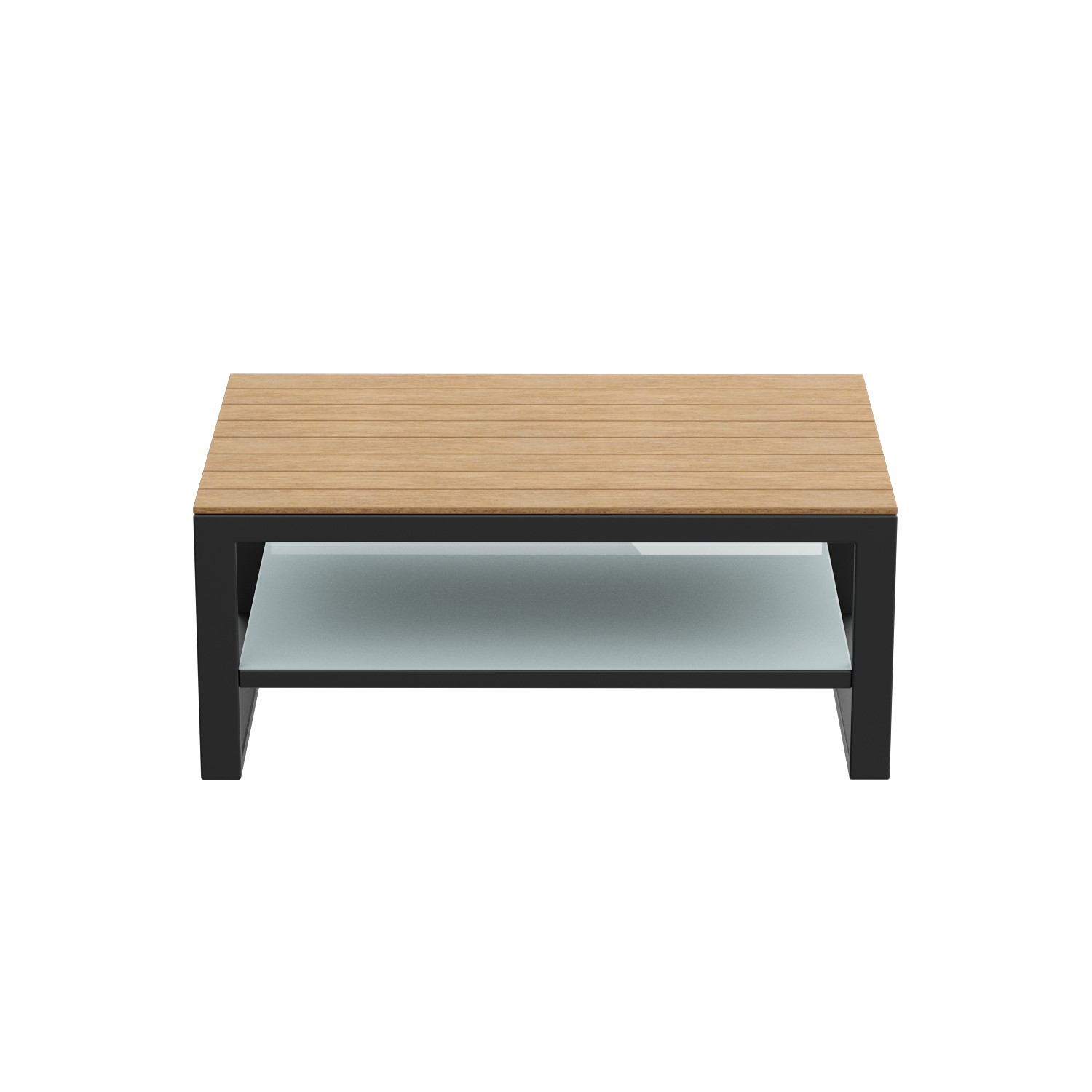 - Material: Tempered glass (shelf), polywood (tabletop), fabric (seat cushions) and aluminium (frames)