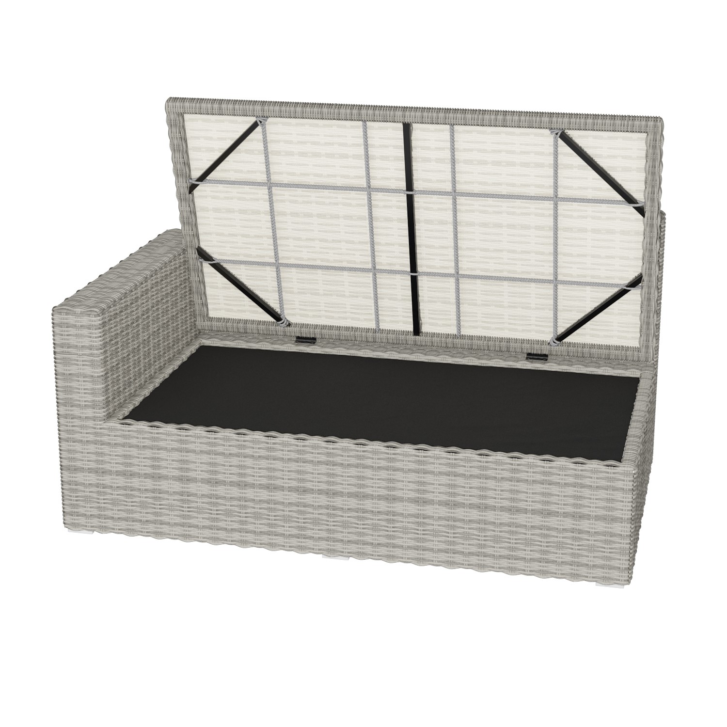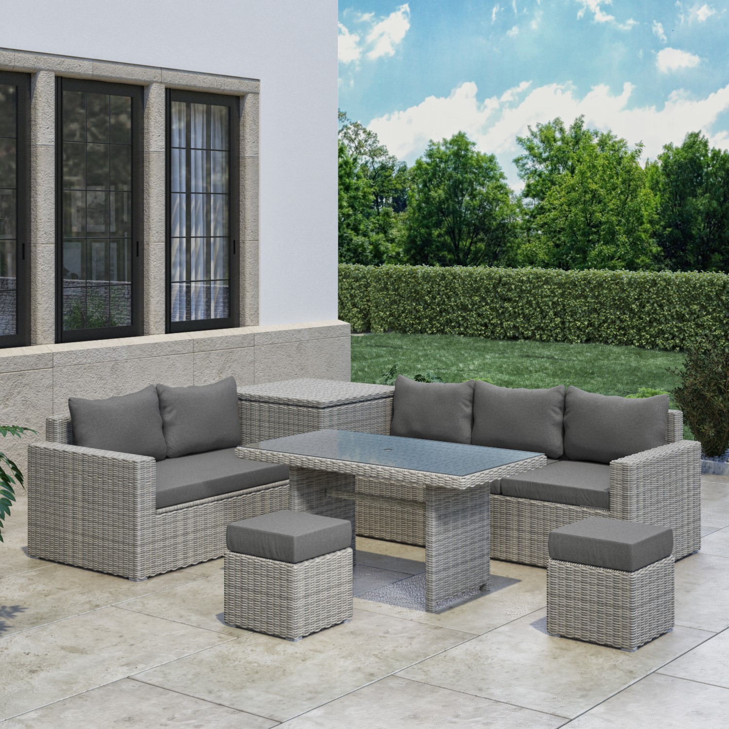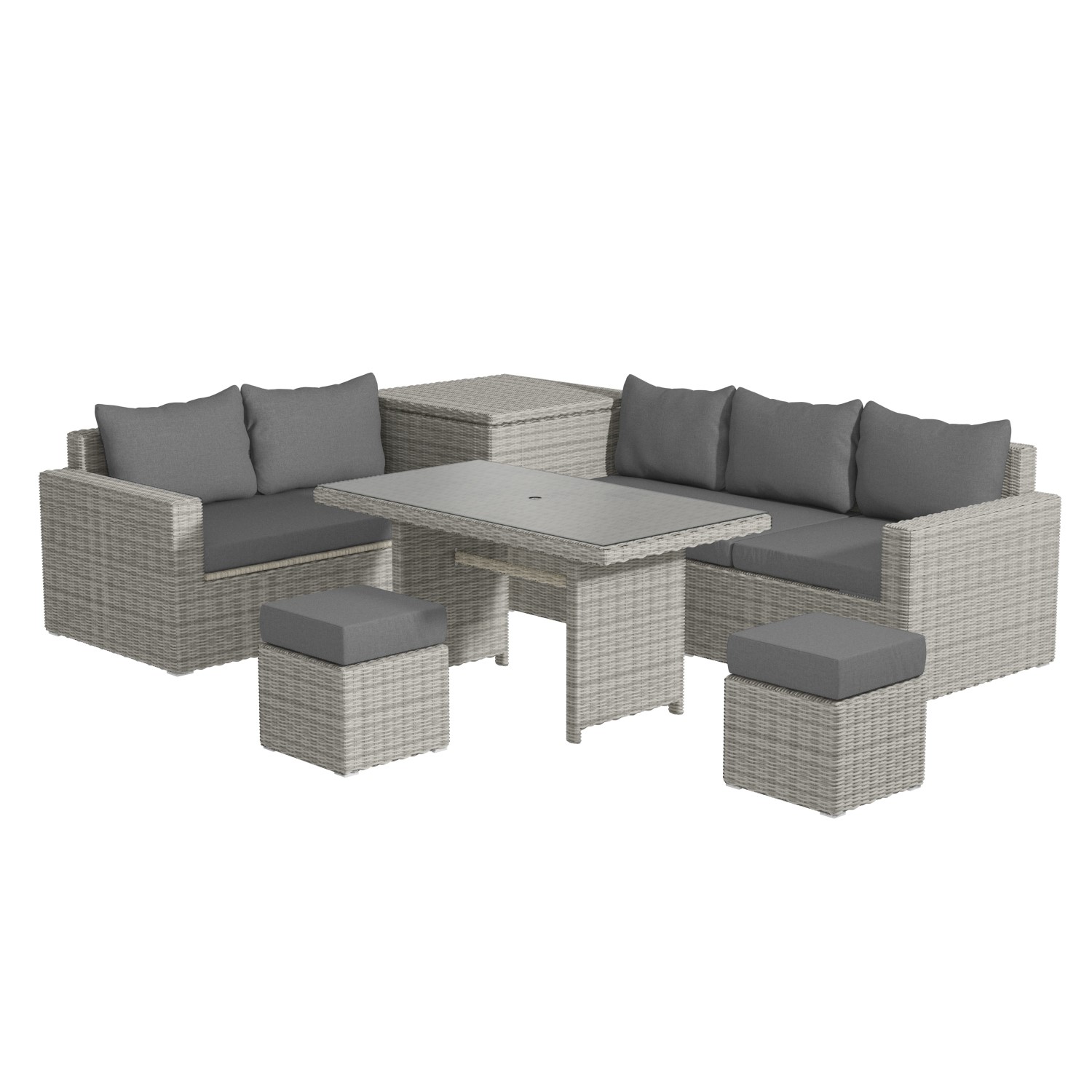 Make a statement with this grey rattan reclining corner sofa set. It’s i deal for cosy get-togethers, dining and relaxing. This sofa set has many uses; use the footstools as extra seating, turn the three-seater into a sun lounger, and hide cushions or essentials in the storage box. Finished in synthetic rattan, it'll withstand all weather.