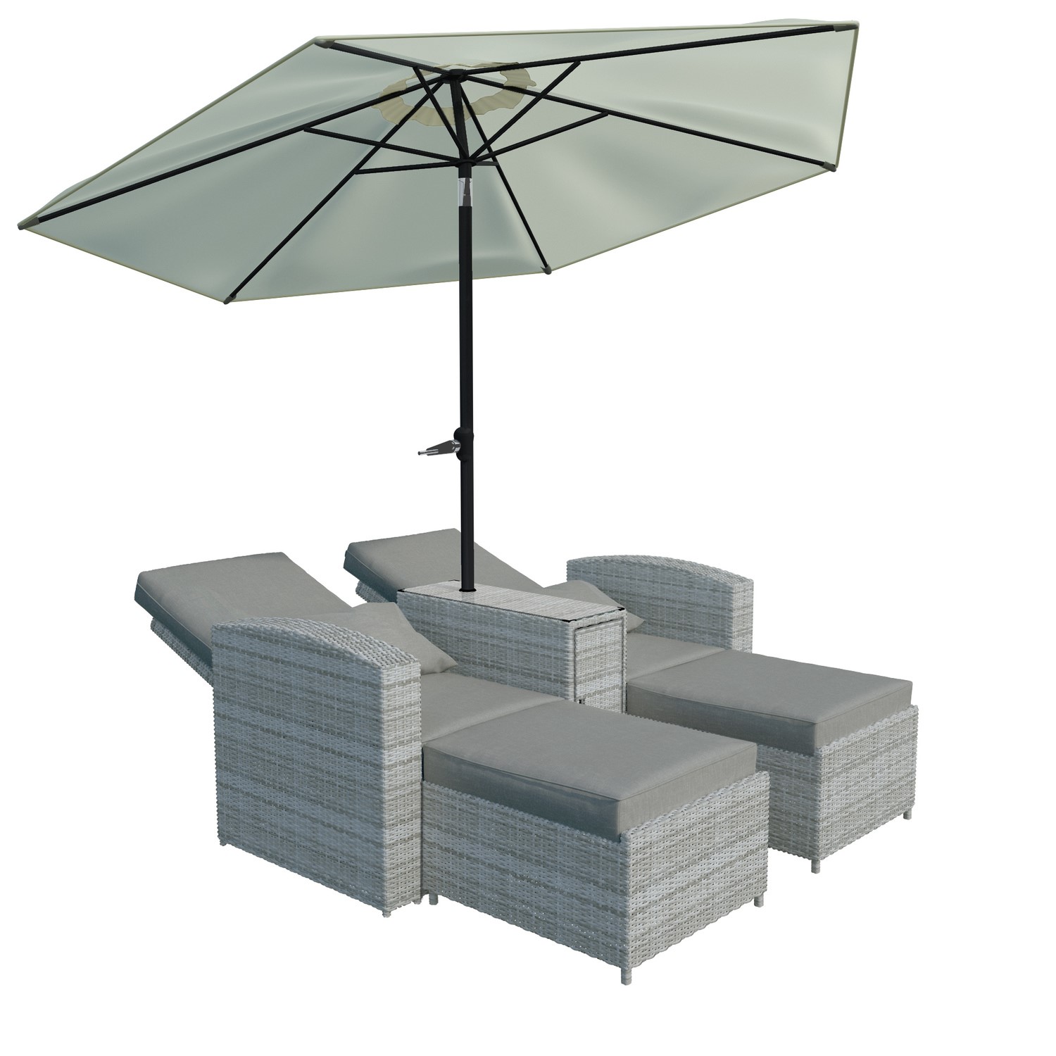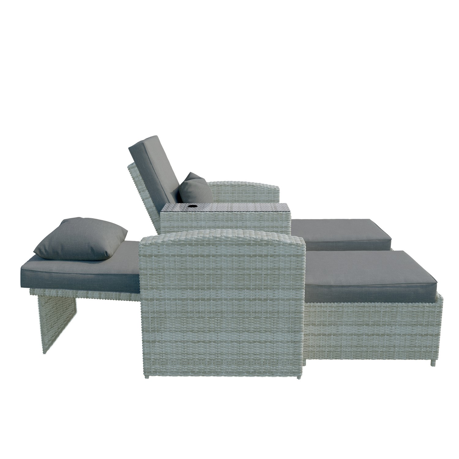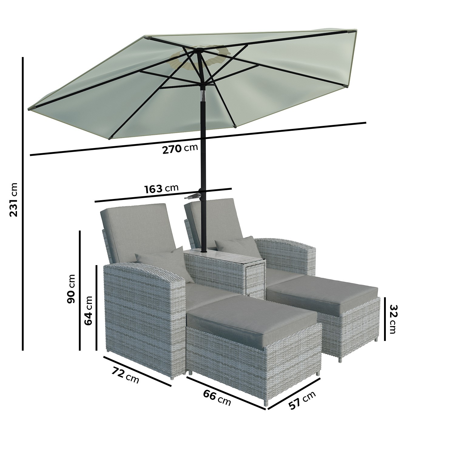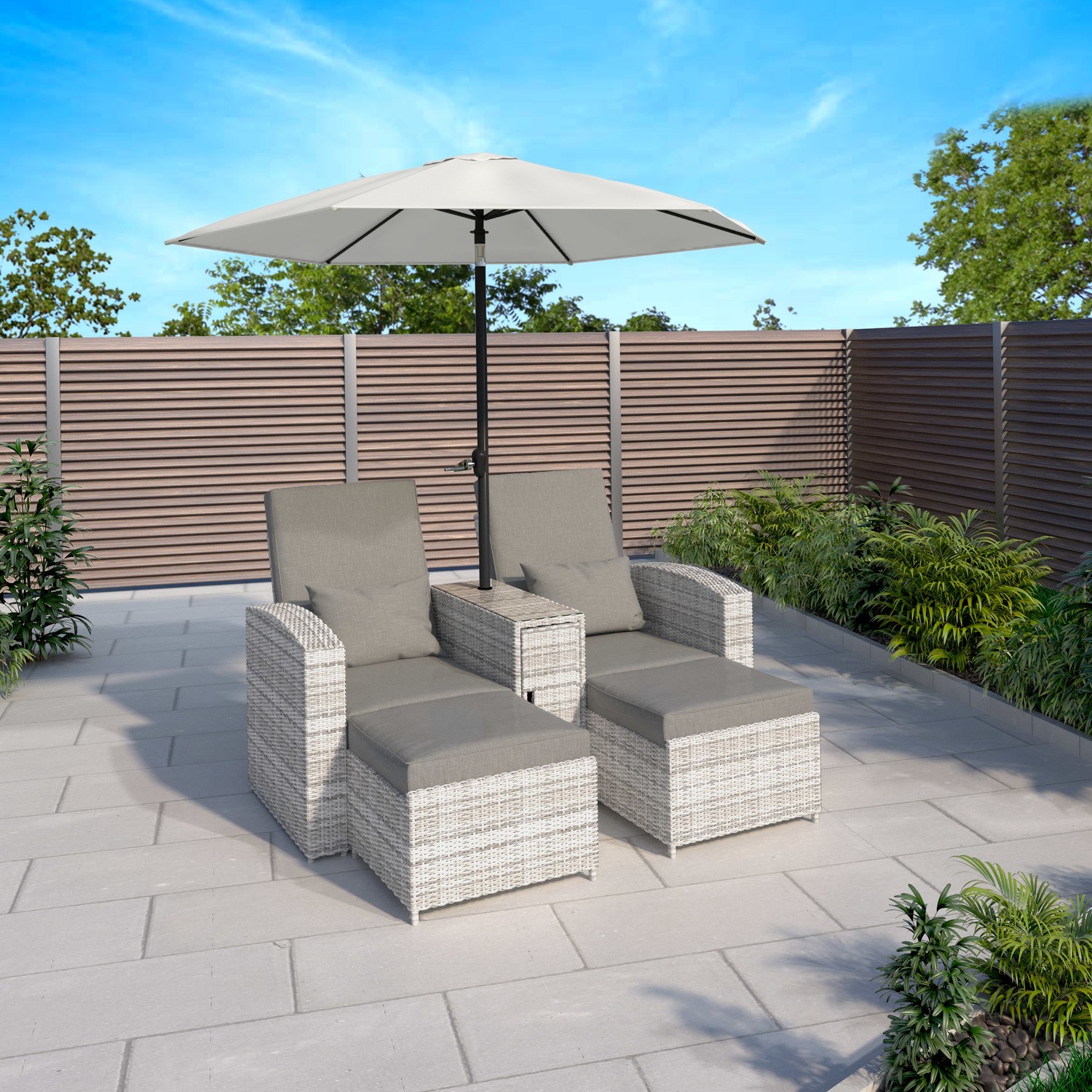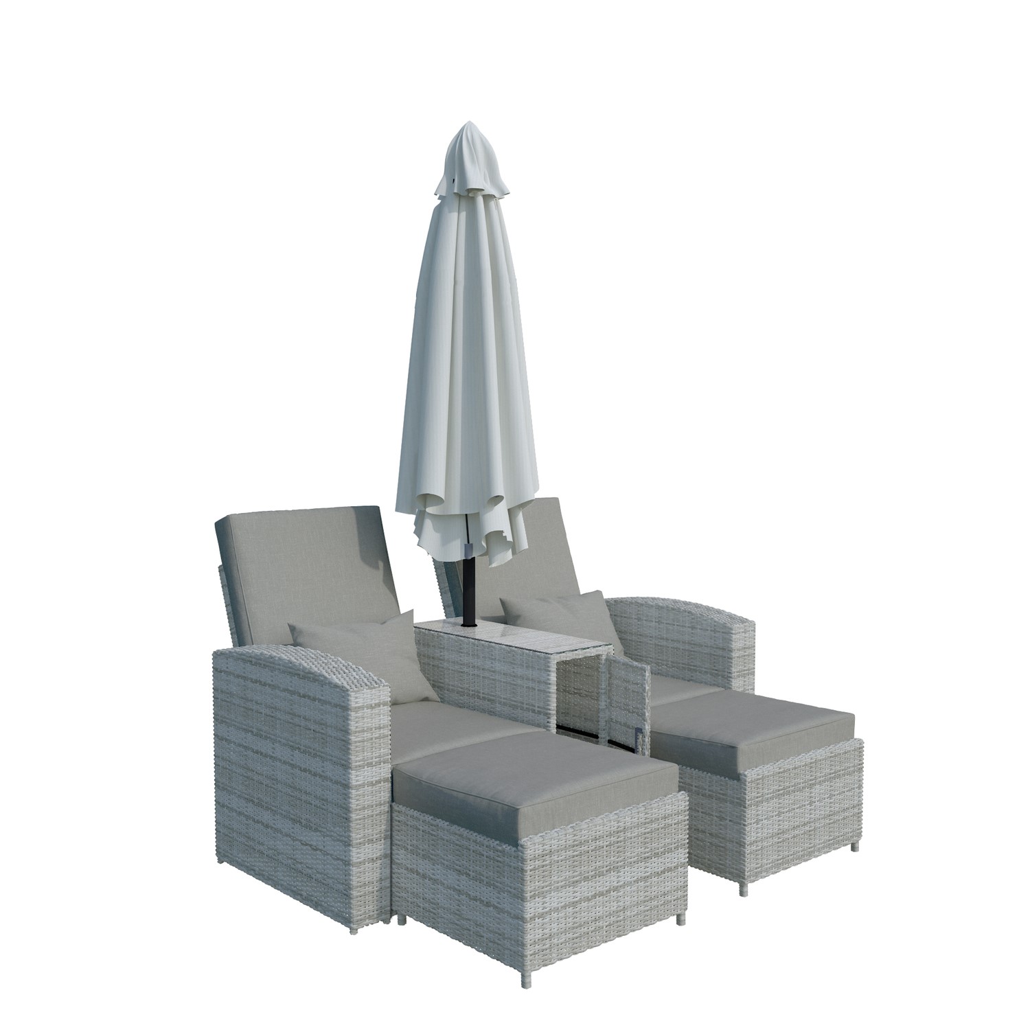 Enjoy companionship with this grey sun lounger set. Set up as a pair of reclining armchairs attached by a central storage table that could be easily used as armrests. It comes with two footstools to put your feet up or fully recline the armchairs and combine the two to create the ultimate sun lounger. Its clever design means that once you've finished, the footstools can be stored inside the chairs. In addition, it hosts a tiltable parasol to protect you from sun and light showers. It slots easily in the table's central parasol hole.