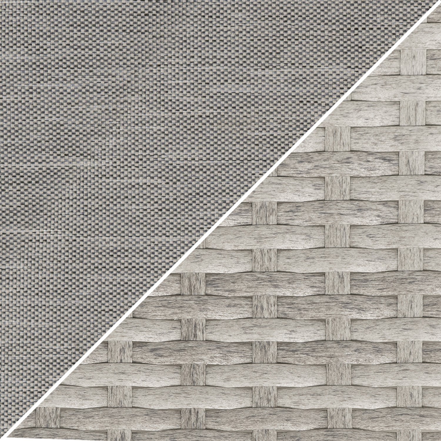 - Material: Synthetic flat rattan, aluminium (frames) spun polyester fabric (cushions) and tempered glass (tabletop)