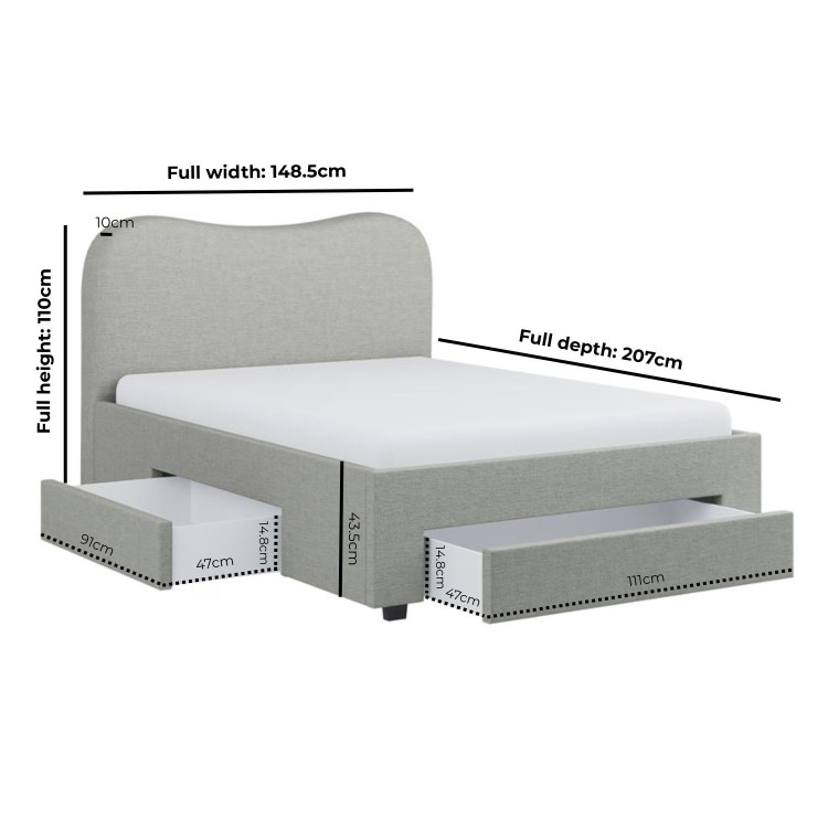 Elevate your bedroom with the Joanie bed, where modern design effortlessly blends style, function, and comfort in a sleek frame. It features a statement curved headboard that adds soft, eye-catching appeal and is upholstered in soft chenille fabric with a modern, textured finish. The neutral grey tone complements a wide range of bedroom decors, while the two built-in drawers, fitted with smooth castor wheels, provide discreet underbed storage for bedding, clothing, or everyday essentials, with effortless access and easy movement. It has sprung slatted base that ensures enhanced mattress support and comfort for a restful night’s sleep. This bed fits a UK standard double-size mattress, which is not included, allowing you the freedom to pair it with a mattress of your choice.