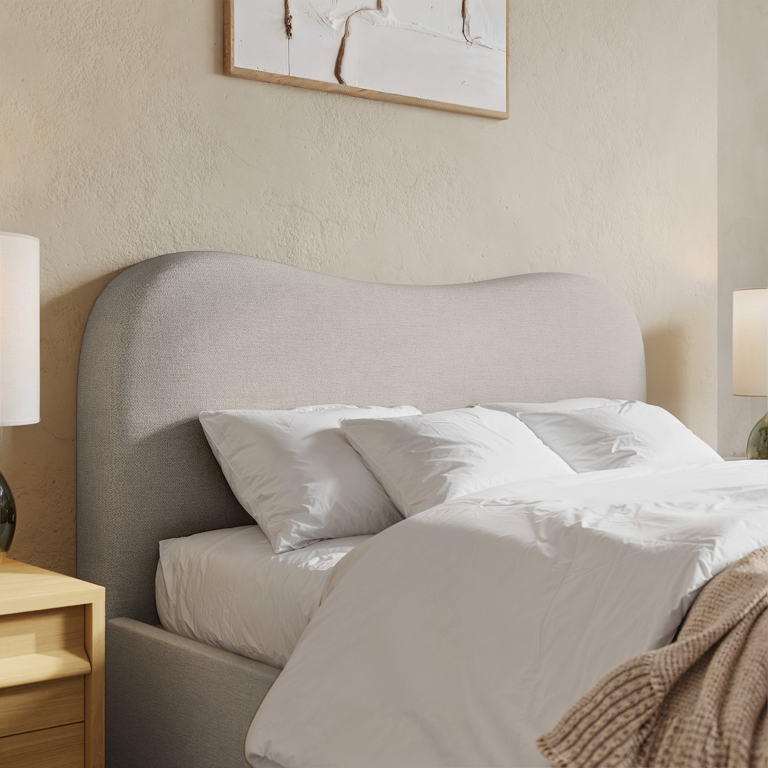 Curved Upholstered Headboard: A soft, gently curved headboard adds a modern, relaxed silhouette and comfortable support for sitting up.