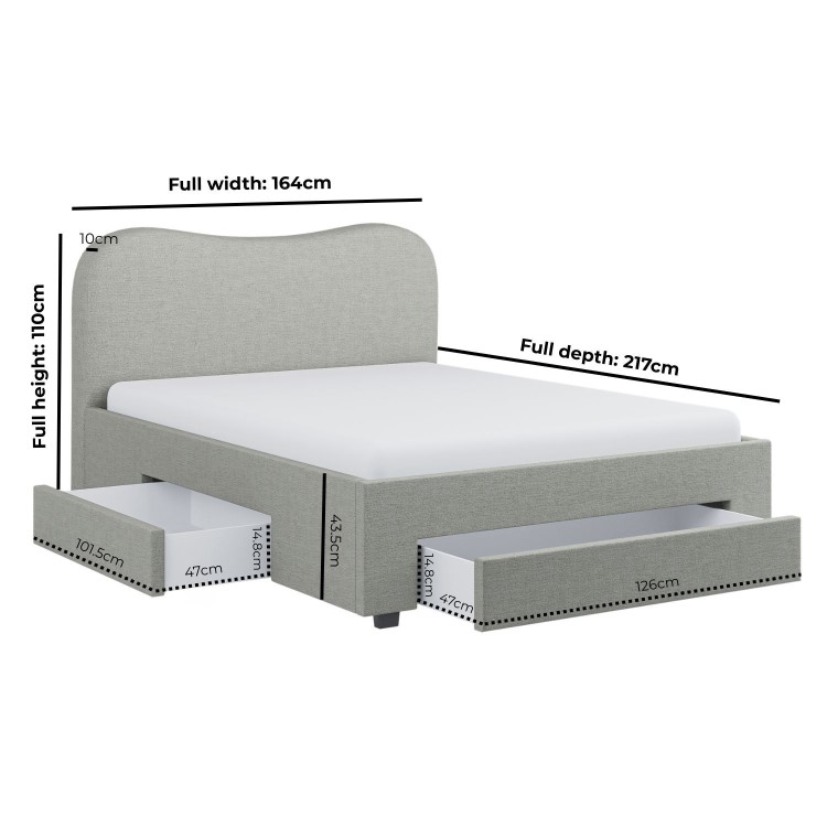 Elevate your bedroom with the Joanie bed, where modern design effortlessly blends style, function, and comfort in a sleek frame. It features a statement curved headboard that adds soft, eye-catching appeal and is upholstered in soft chenille fabric with a modern, textured finish. The neutral grey tone complements a wide range of bedroom decors, while the two built-in drawers, fitted with smooth castor wheels, provide discreet underbed storage for bedding, clothing, or everyday essentials, with effortless access and easy movement. It has sprung slatted base that ensures enhanced mattress support and comfort for a restful night’s sleep. This bed fits a UK standard king-size mattress, which is not included, allowing you the freedom to pair it with a mattress of your choice.