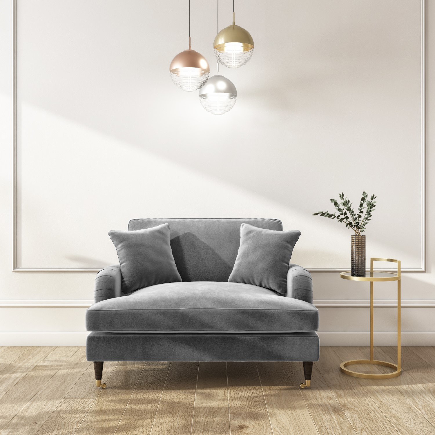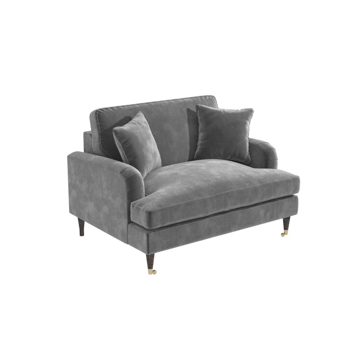Discover maximum comfort and minimum maintenance with this gorgeous, foam-filled loveseat. This plush Payton Love seat offers traditional styling with a modern twist thanks to its dark wooden legs with gold accent front castors and classic ruched saddle arms. The love chair is beautifully tailored and upholstered in grey velvet, it brings a splash of colour to your living space, making it the perfect statement piece. It comfortably seats two and comes accompanied with two matching throw cushions which add a final flourish of elegance.