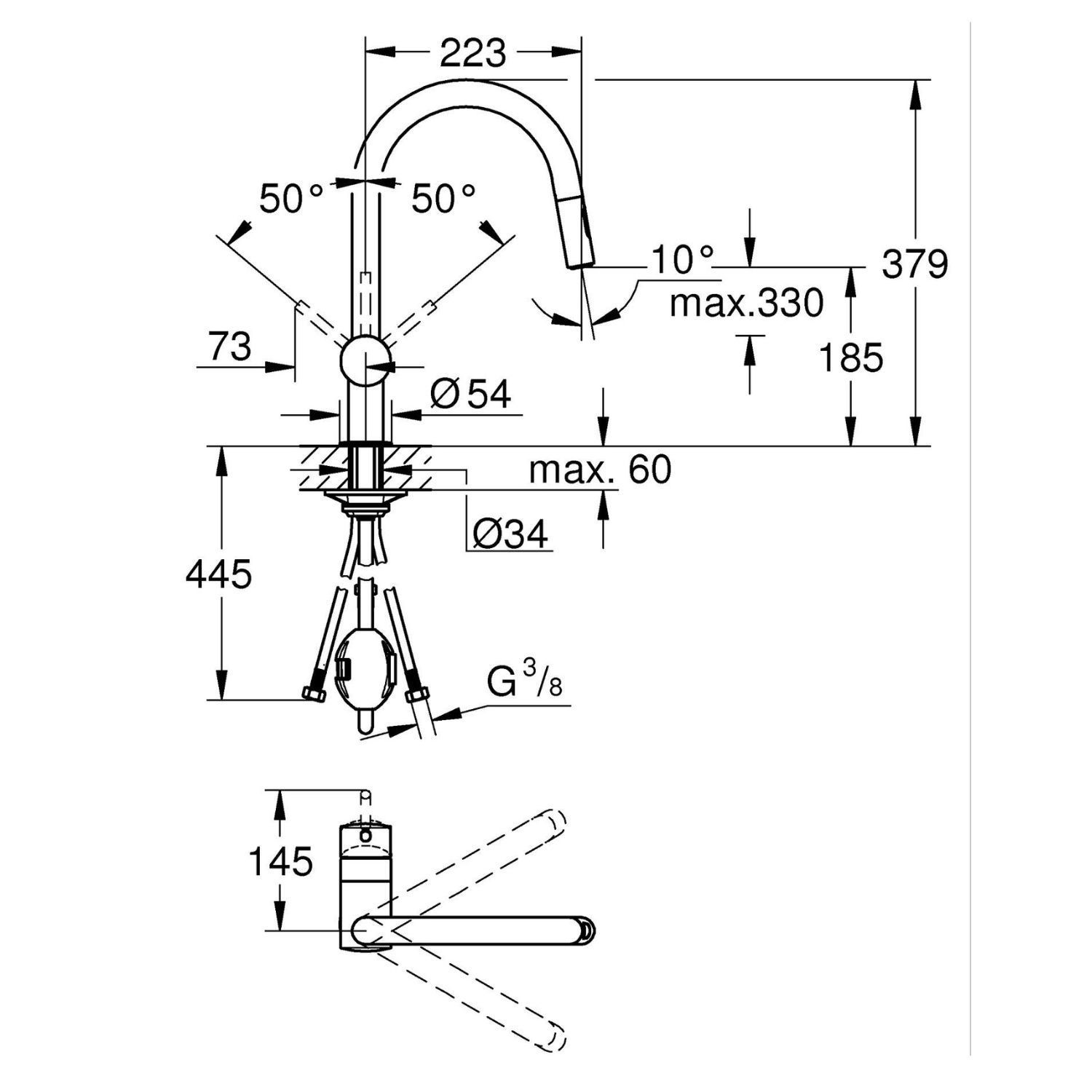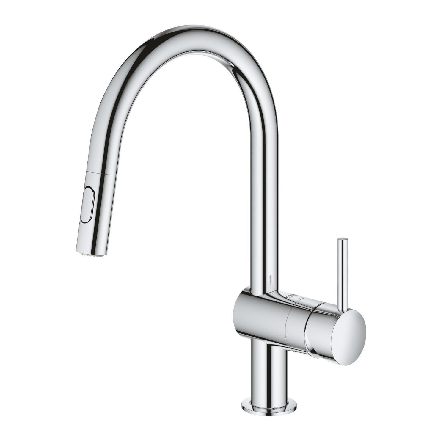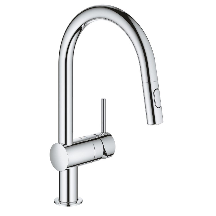 The GROHE Minta Kitchen Mixer Tap with C spout and pull-out dual spray head brings a combination of style and functionality to the modern kitchen. Its L-style spout design provides excellent clearance for everyday tasks such as filling pots, rinsing dishes, and cleaning the sink.