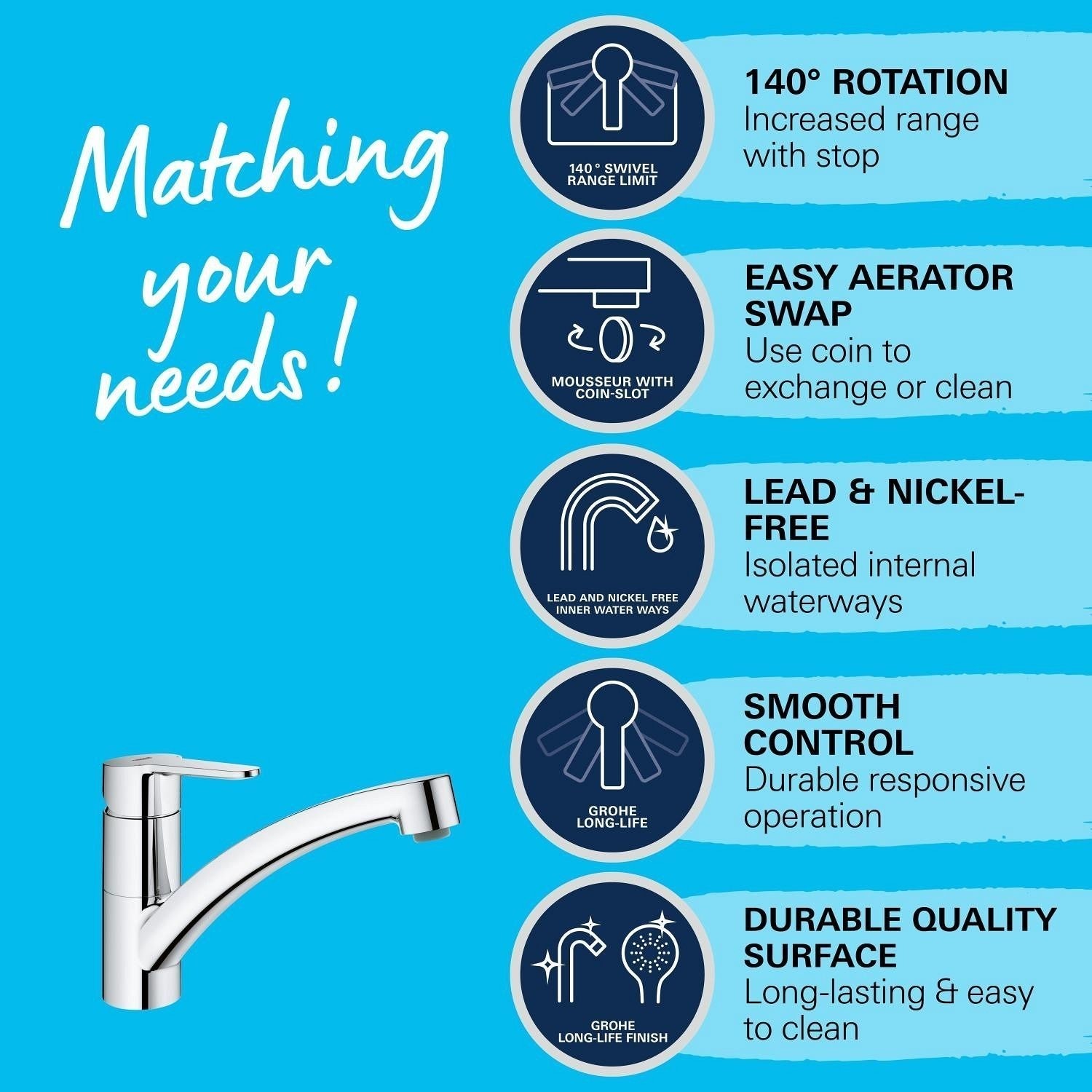 Equipped with a 35mm ceramic cartridge, this tap ensures smooth, reliable, and drip-free operation. Suitable for systems operating from 1 bar pressure, it combines functional design with trusted GROHE quality. To maintain the chrome finish, avoid cleaning with harsh or abrasive chemicals.