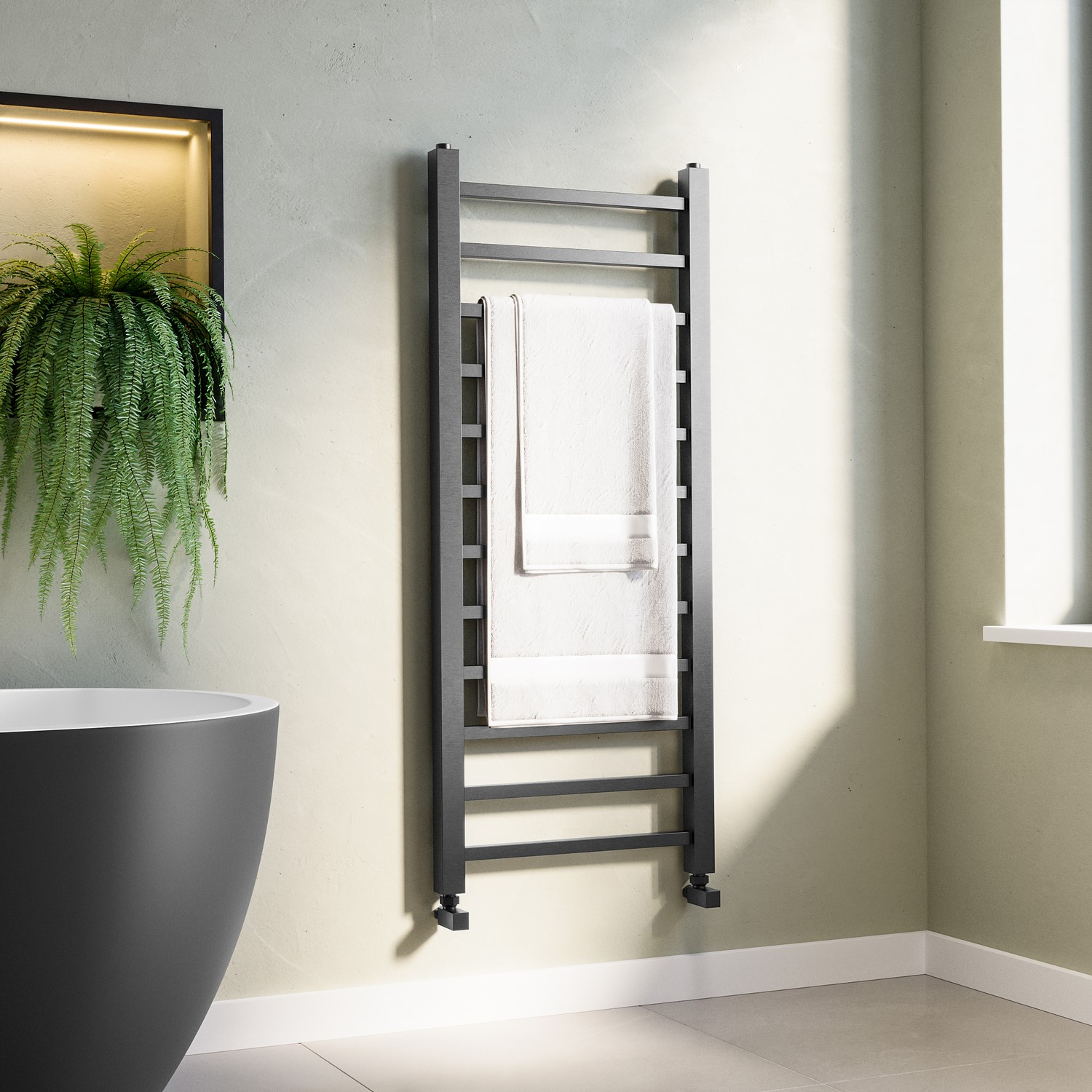 This modern towel radiator is the perfect addition to any bathroom, combining style and functionality. Designed as a vertical radiator, it saves space while providing a high heat output of 1048 BTU, ensuring your bathroom stays warm and comfortable. With its sleek 12-bar design features square bars that not only add a contemporary edge but also provide plenty of space to hang and dry your towels quickly and efficiently. Its brushed gunmetal grey finish and minimalist aesthetic make it a stylish focal point for any modern bathroom.
