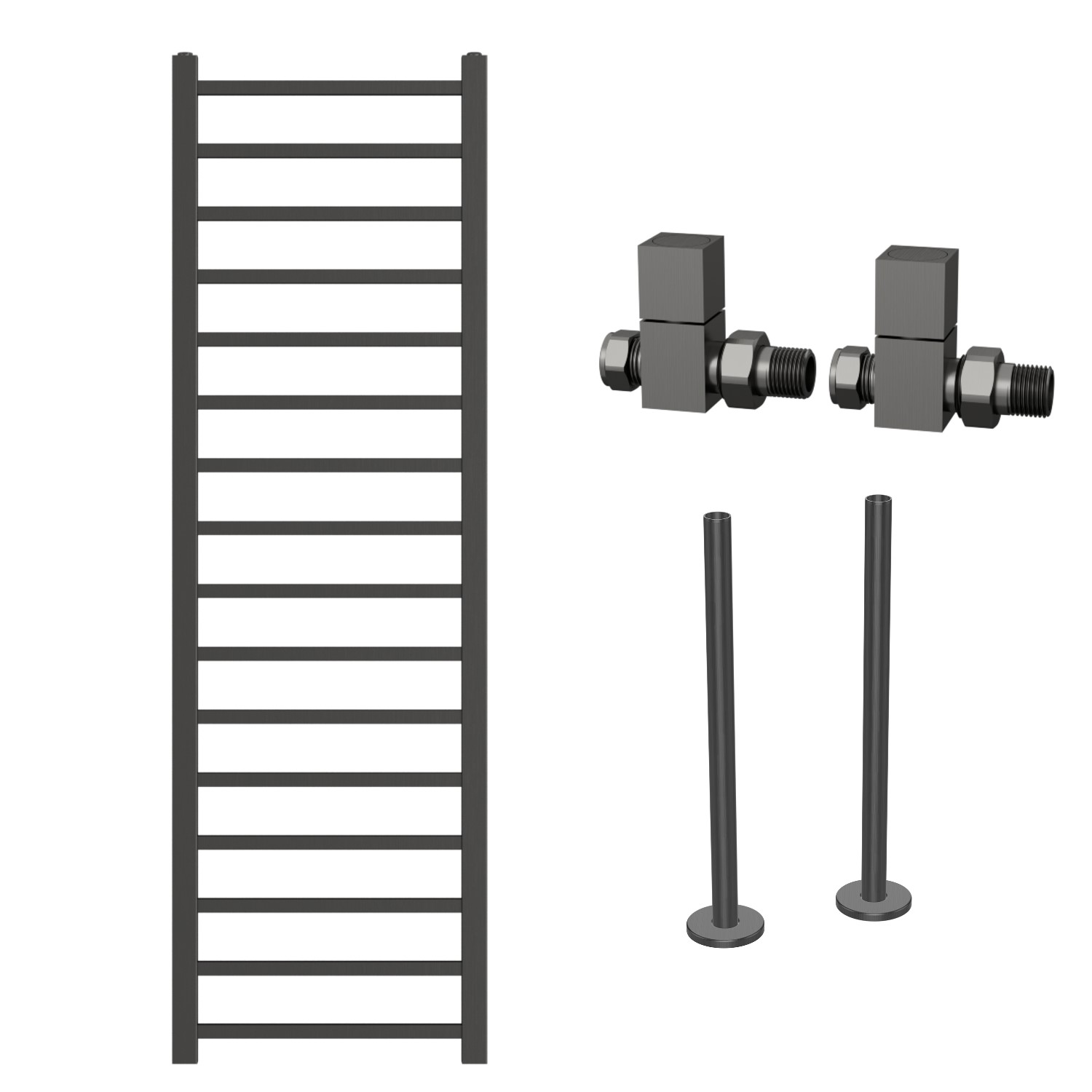 Crafted from high-quality steel, this towel radiator is built to endure humid environments. Its anti-rust and anti-corrosion properties boost durability, while the excellent heat conduction guarantees lasting warmth. Easy to clean and low maintenance, it’s a smart and elegant solution for both heating and towel storage. The matching gunmetal grey pipe cover kit is perfect for hiding unsightly copper pipes between the floor and your radiator valves. The straight manual radiator valves have a cross-head design that brings modern charm to any bathroom.