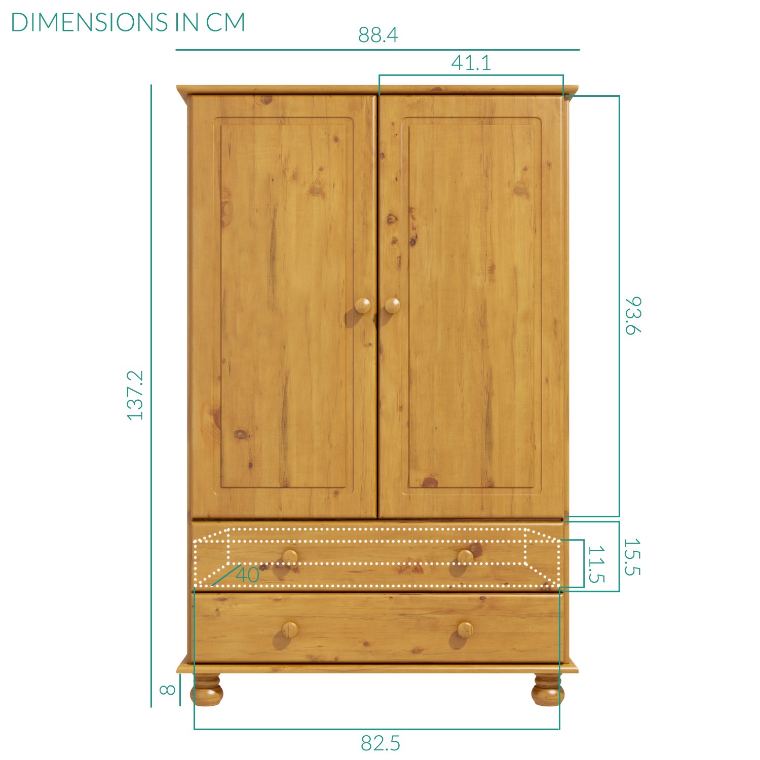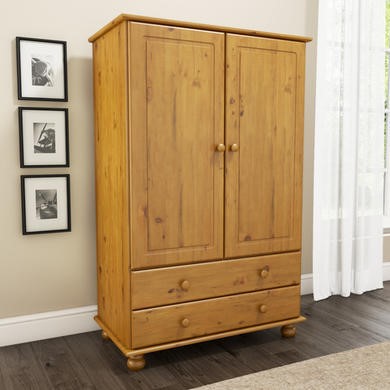 This combination wardrobe is ideal for hanging storage and folded storage with 2 wide drawers at the base. The double doors conceal a full width internal hanging rail, perfect for easy-crease items and wardrobe staples. The drawers come in ideal for folded items, bulkier items or even accessories. With a shorter than standard height this wardrobe is also an excellent choice for smaller rooms, loft spaces and younger users.