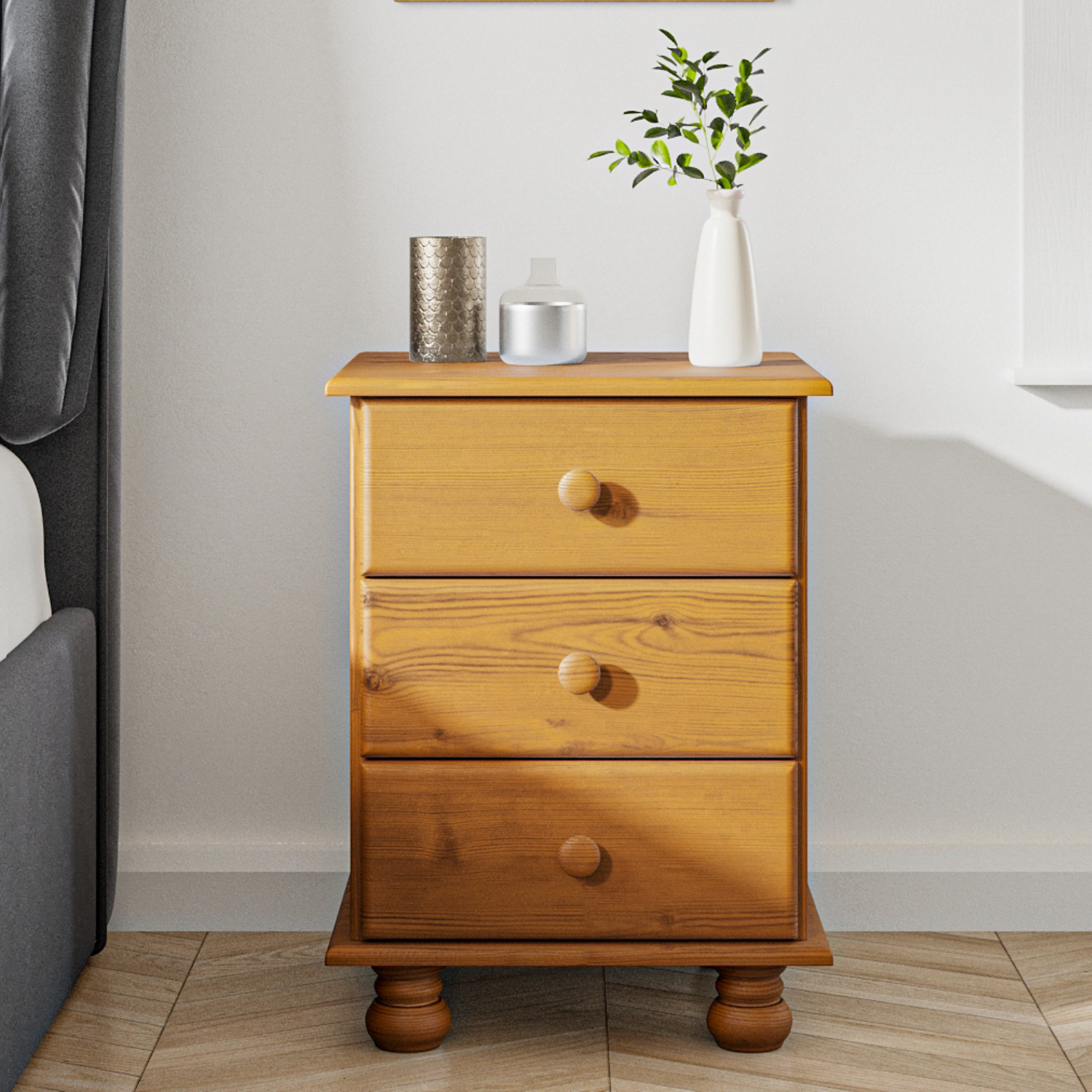 - Classic bedside table with rich pine finish