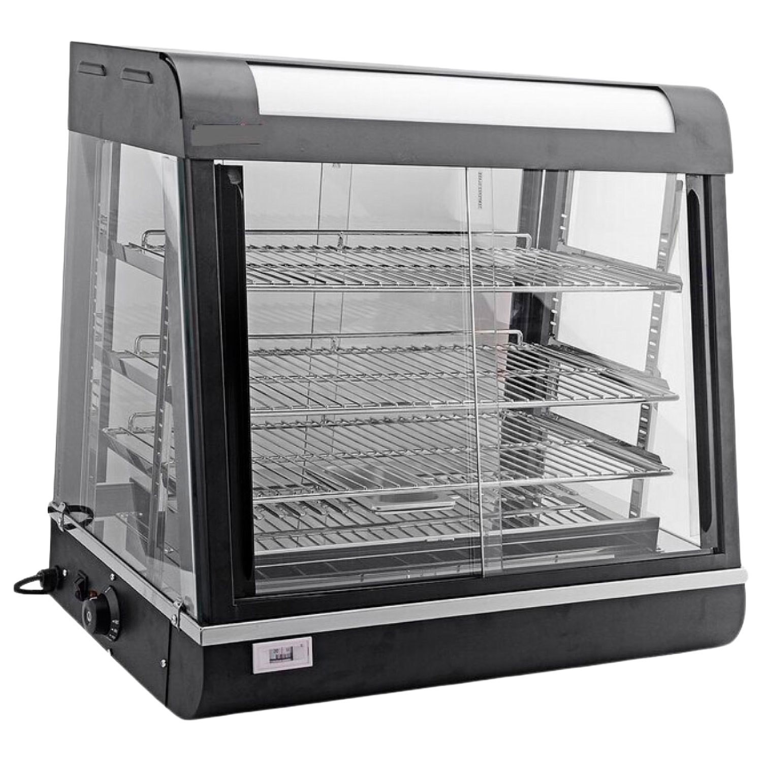 Finished in a smart black exterior colour with smooth curved front top and a large 110ltr capacity, this great value unit is sure to promote your heated goods to their full potential. The Hamoki FM26 is built to withstand the rigors of daily commercial use while maintaining a sleek and professional appearance. The glazed tempered glass panels offer excellent insulation, retaining heat effectively while allowing customers to view food items from multiple angles. Featuring front and rear sliding glass doors, 3 x adjustable chrome shelves and precise temperature controls, this unit ensures your products are displayed at their best, whilst the internal humidity control tray keeps items warm and fresh without drying out. Additionally, the interior lighting enhances the appeal of the products, helping to boost sales by enticing customers. Absolutely perfect for for storing hot food, chicken, samosa, pies etc.