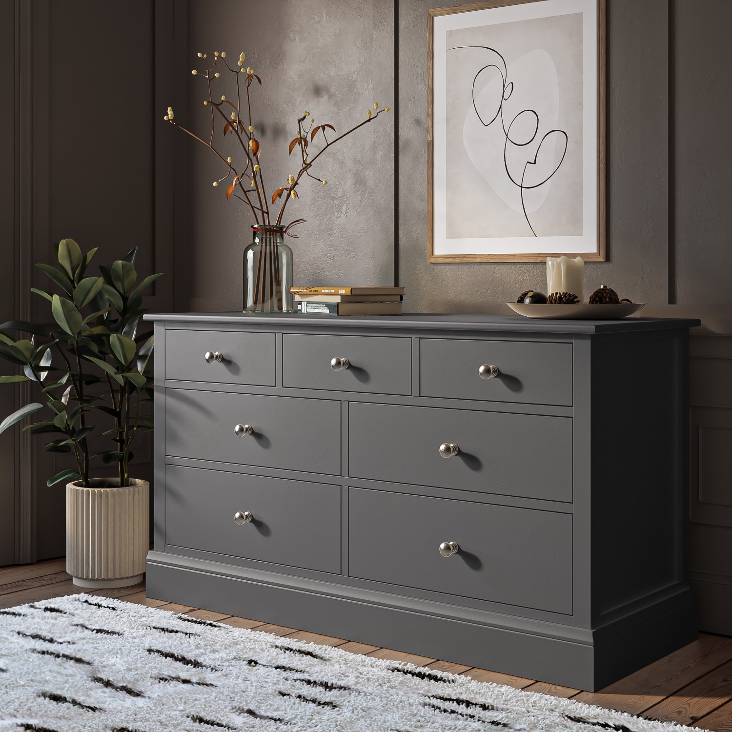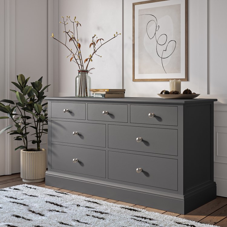 This seven drawer chest is durable and visually appealing with its clean and classic aesthetic. It's been crafted from solid wood with a grey painted and lacquered finish. Housing four large drawers and three smaller drawers there's plenty of space to store and organise folded items. The drawers have durable wooden runners and have been finished beautifully with simple knob handles in shiny chrome. The surface top comes in handy for a bedroom TV or dresser space to display perfume bottles and trinkets.