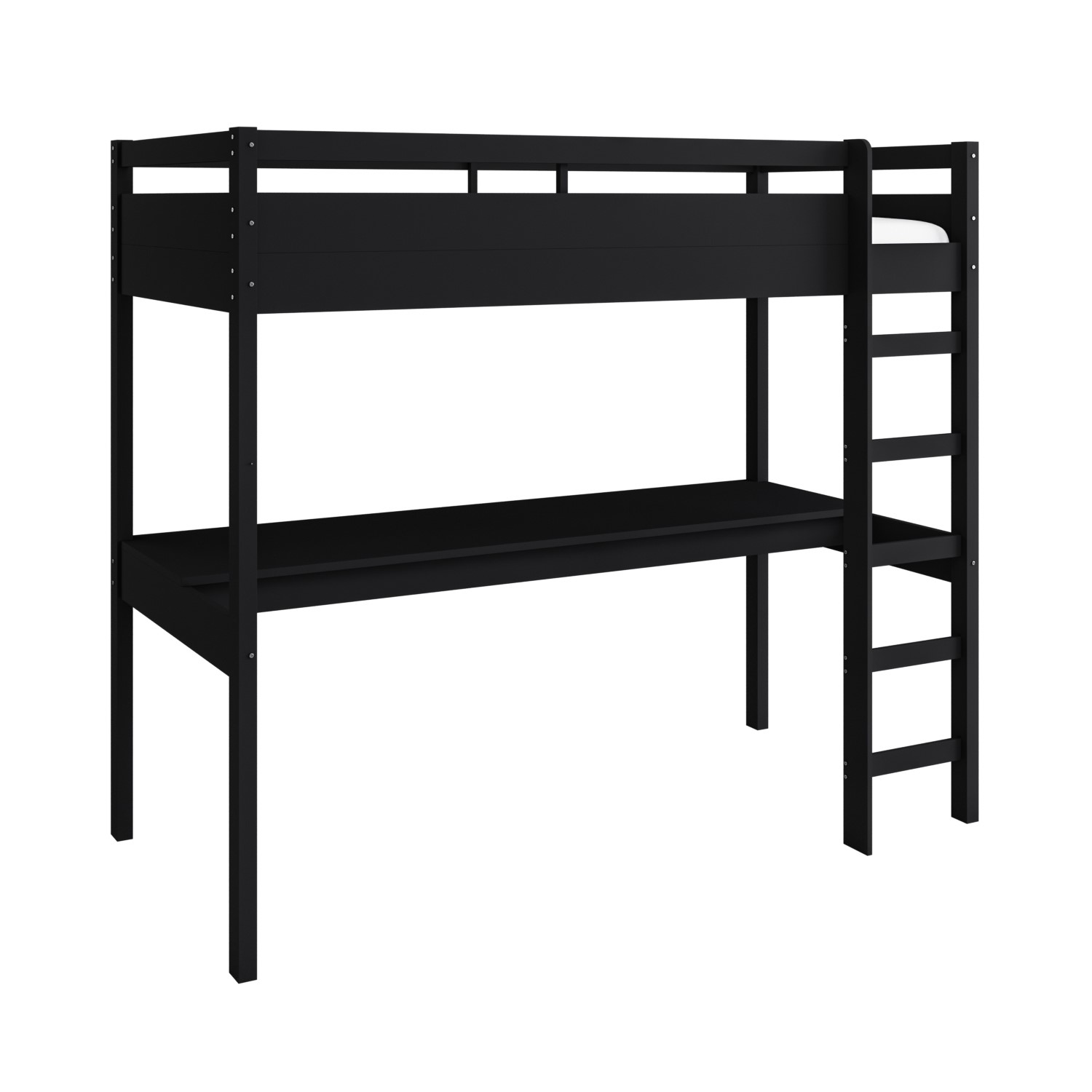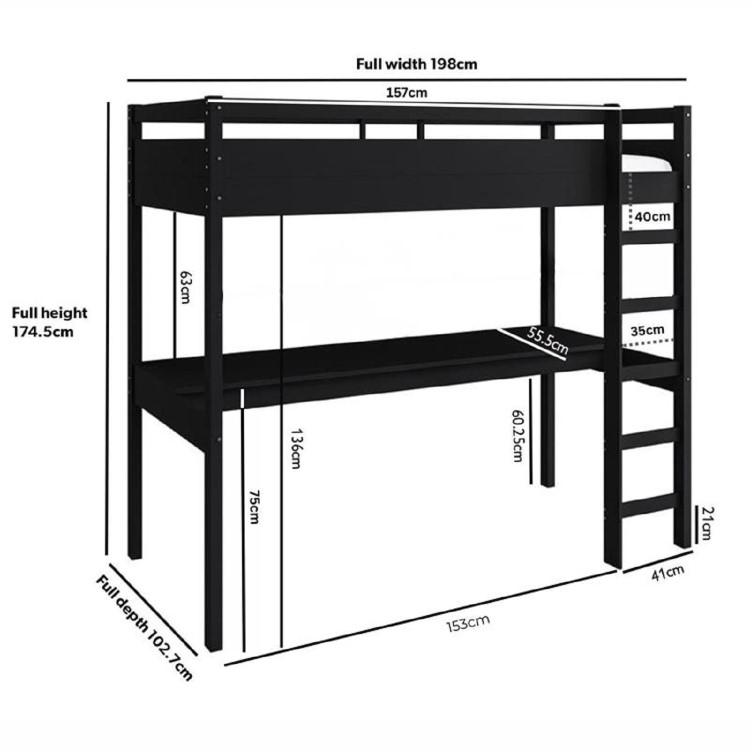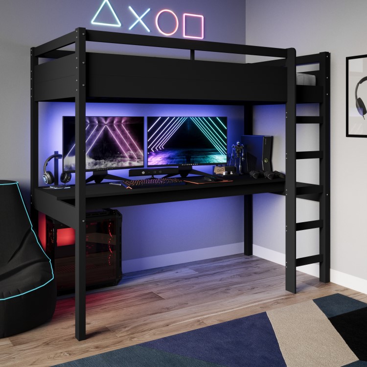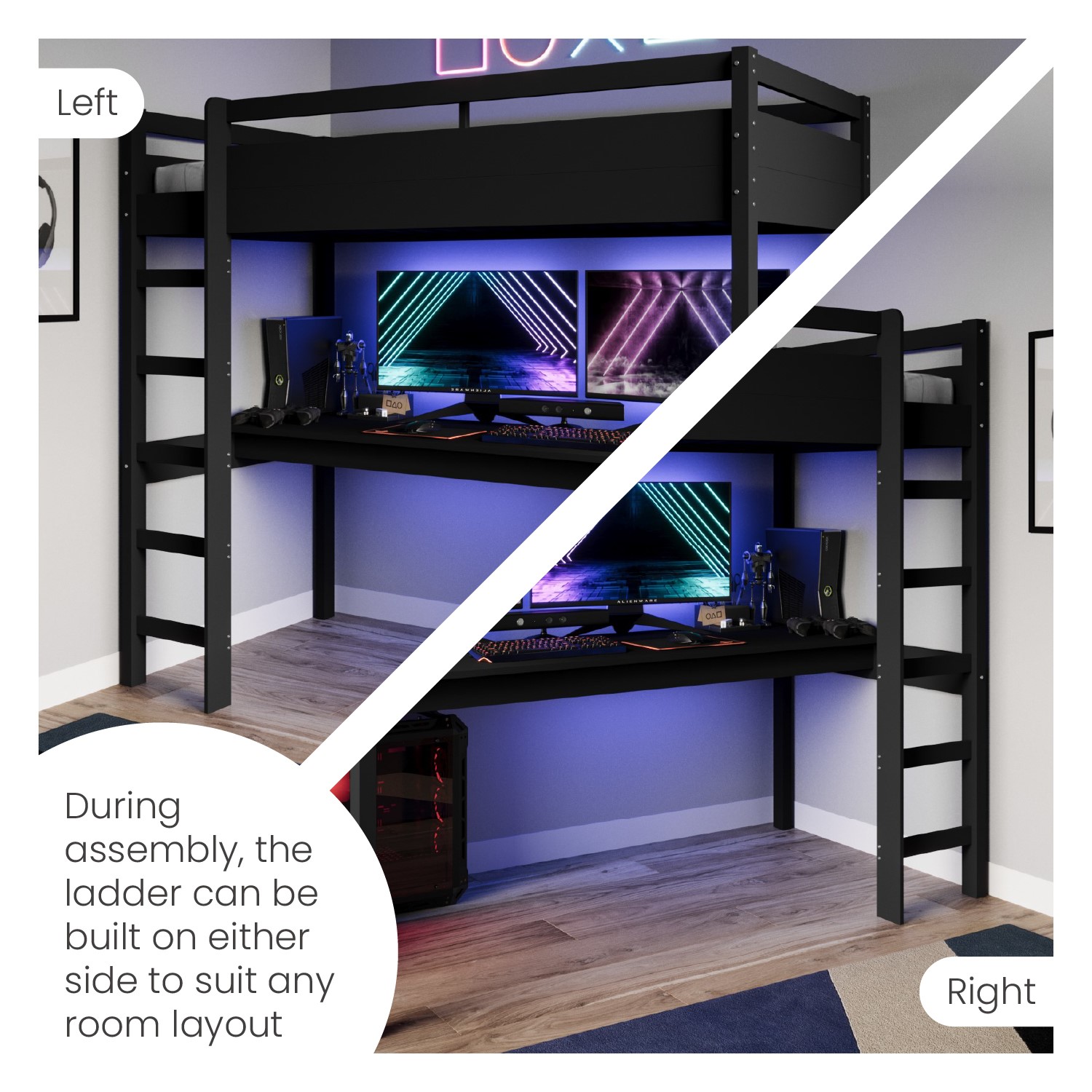 This Wyatt high sleeper bed finished in a sleek black for a modern aesthetic. It features a full-width desk beneath for both studying and gaming, providing ample space to accommodate large-scale monitors, gaming PC and accessories. This bed is crafted from safe and sturdy solid pine to offer a secure space to sleep and chill, and the ladder can be positioned on either the left or right side, offering flexibility for various room layouts.
