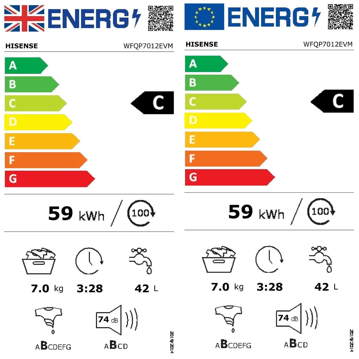 The Hisense WFQP7012EVM 1 Series washing machine takes the effort out of laundry. This 7kg washing machine is just right for everyday family loads, and its slim 45cm depth means it fits neatly into smaller spaces, giving you more room. Enjoy quieter washes thanks to the Inverter motor, which also helps save energy and lasts longer. Plus, its C-rated energy efficiency means lower electricity bills for your home.