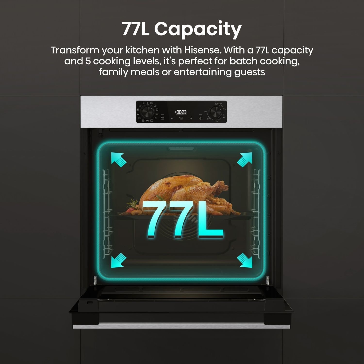 Transform your kitchen with the Hisense 77L capacity oven, perfect for family meals and entertaining guests. This spacious oven features 5 cooking levels, allowing you to simultaneously cook meals, ideal for hosting guests or if you’re an avid batch cooker.