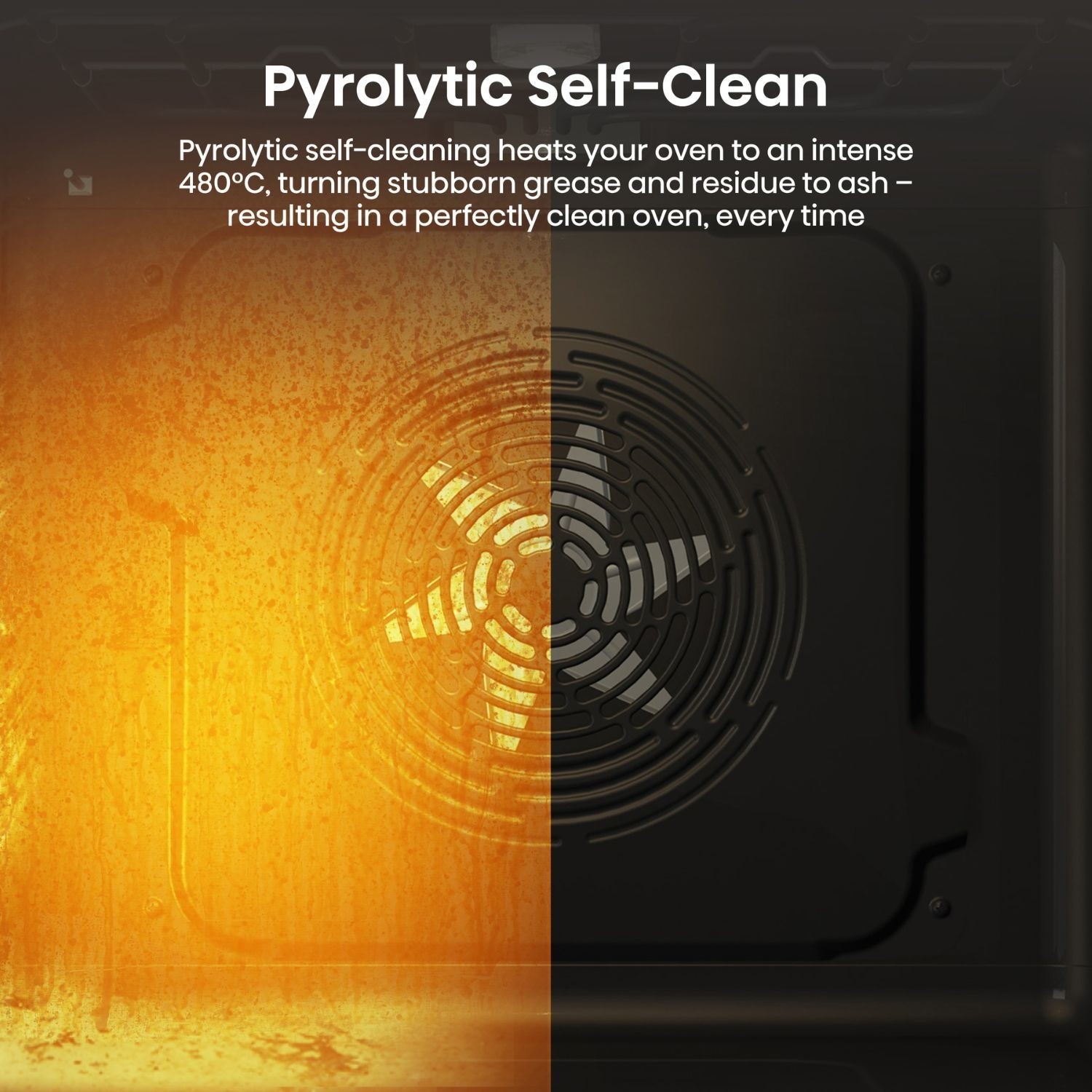 Tackle tough cleaning the effortless way with pyrolytic self-cleaning. The oven heats up to an intense 480°C, turning grease, grime, and food residue into fine ash that can simply be wiped away. No chemicals, no scrubbing, just a spotless oven, ready for your next culinary creation.