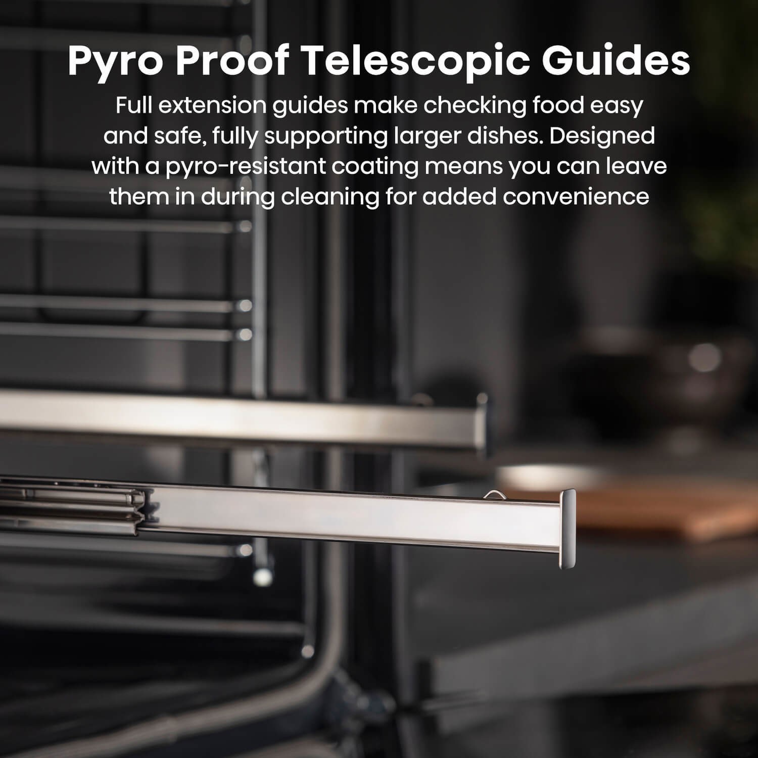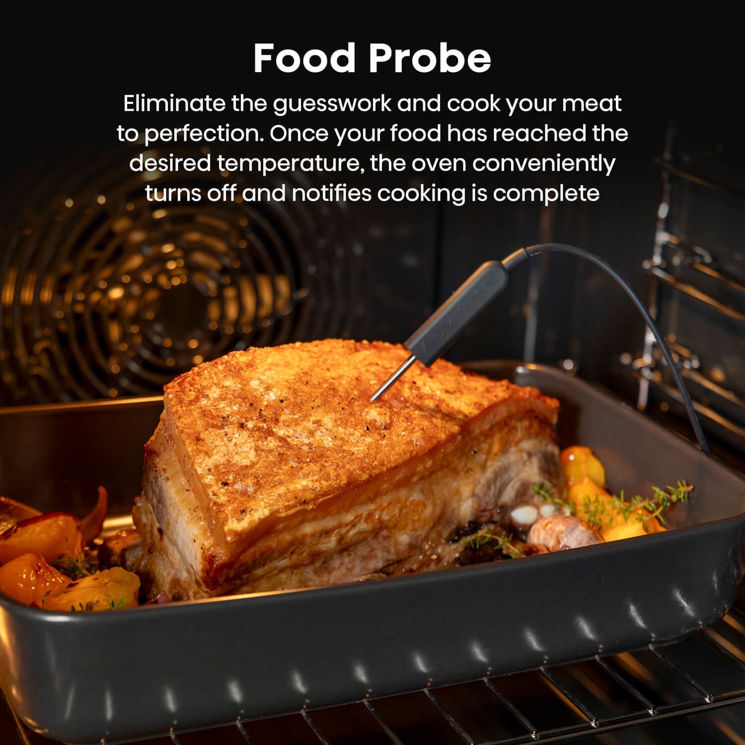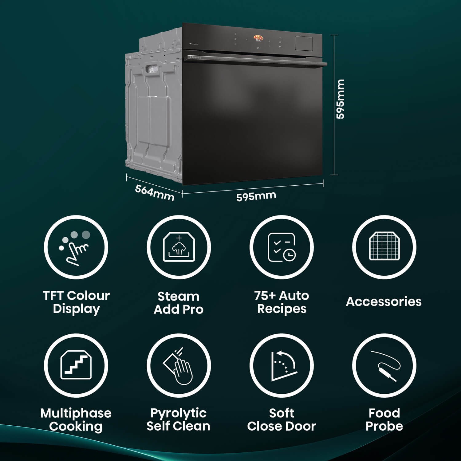 Experience the future of cooking with the BlackLine Hi8 BAS614PH8BGWF Built in Electric Pyrolytic Single Oven and make every meal a masterpiece. This oven boasts a generous 77L capacity, making it perfect for family meals and entertaining guests. Its premium jet-black glass design, coupled with simple one-touch controllability, offers both style and ease of use, seamlessly fitting into any modern kitchen aesthetic. Equipped with a state-of-the-art TFT colour display, navigating through cooking modes and settings becomes intuitive and visually engaging. Whether you're utilising the innovative Steam Add Pro built in generator with 1.2L water tank for precise moisture control or exploring various cooking functions, such as the convenient Air Fry mode with its dedicated perforated tray or the specialised Pizza mode for perfect crispy crusts, the Hi8 BlackLine ensures versatility to meet your culinary needs. Experience unparalleled convenience with the speedy preheat, getting you to 200°C in just 5 minutes, ensuring you can start cooking in no time. With Wi-Fi connectivity, you can control and monitor the oven remotely. Whether you're in another room or out of the house, you can adjust settings, start preheating or check on cooking progress using your smartphone. Automatic programmes further enhance your culinary endeavours by simplifying complex cooking processes, by optimising settings for different dishes, ensuring consistent, delicious results every time. For effortless maintenance, this oven features a pyrolytic self-clean function, capable of reducing food residue to ash using high temperatures, paired with pyro proof telescopic guides for safe and easy shelf handling.