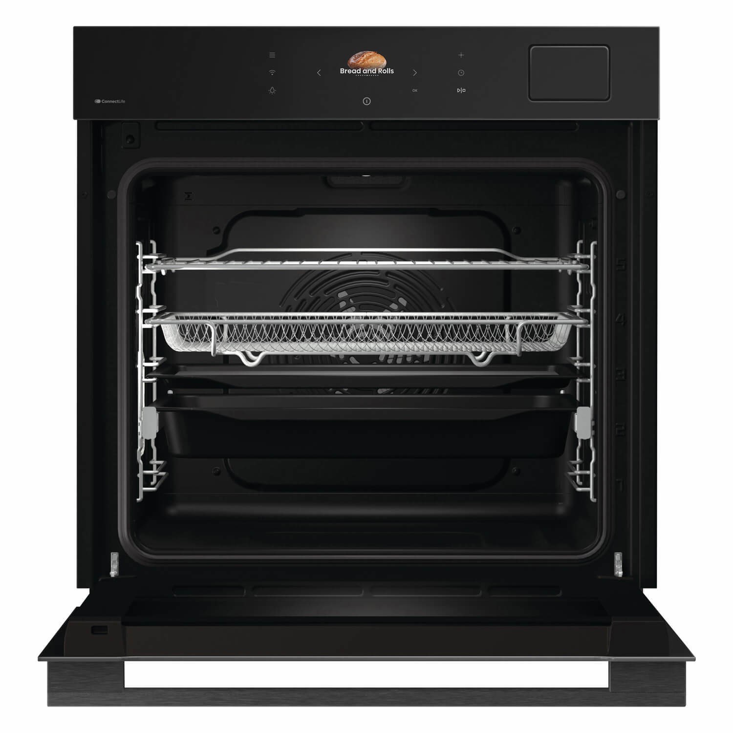 Experience the future of cooking with the BlackLine Hi8 BAS6AH8BUKWF Built in Electric Steam Single Oven and make every meal a masterpiece. This oven boasts a generous 77L capacity, making it perfect for family meals and entertaining guests. Its premium jet-black glass design, coupled with simple one-touch controllability, offers both style and ease of use, seamlessly fitting into any modern kitchen aesthetic. Equipped with a state-of-the-art TFT colour display, navigating through cooking modes and settings becomes intuitive and visually engaging. Whether you're utilising the innovative Steam Add Pro built in generator with 1.2L water tank for precise moisture control or exploring various cooking functions, such as the convenient Air Fry mode with its dedicated perforated tray or the specialised Pizza mode for perfect crispy crusts, the Hi8 BlackLine ensures versatility to meet your culinary needs. Experience unparalleled convenience with the speedy preheat, getting you to 200°C in just 5 minutes, ensuring you can start cooking in no time. With Wi-Fi connectivity, you can control and monitor the oven remotely. Whether you're in another room or out of the house, you can adjust settings, start preheating or check on cooking progress using your smartphone. Automatic programmes further enhance your culinary endeavours by simplifying complex cooking processes, by optimising settings for different dishes, ensuring consistent, delicious results every time. For effortless maintenance, enjoy the convenience of steam cleaning, which efficiently removes food residue and grease using the power of steam, keeping your oven in pristine condition with minimal effort.