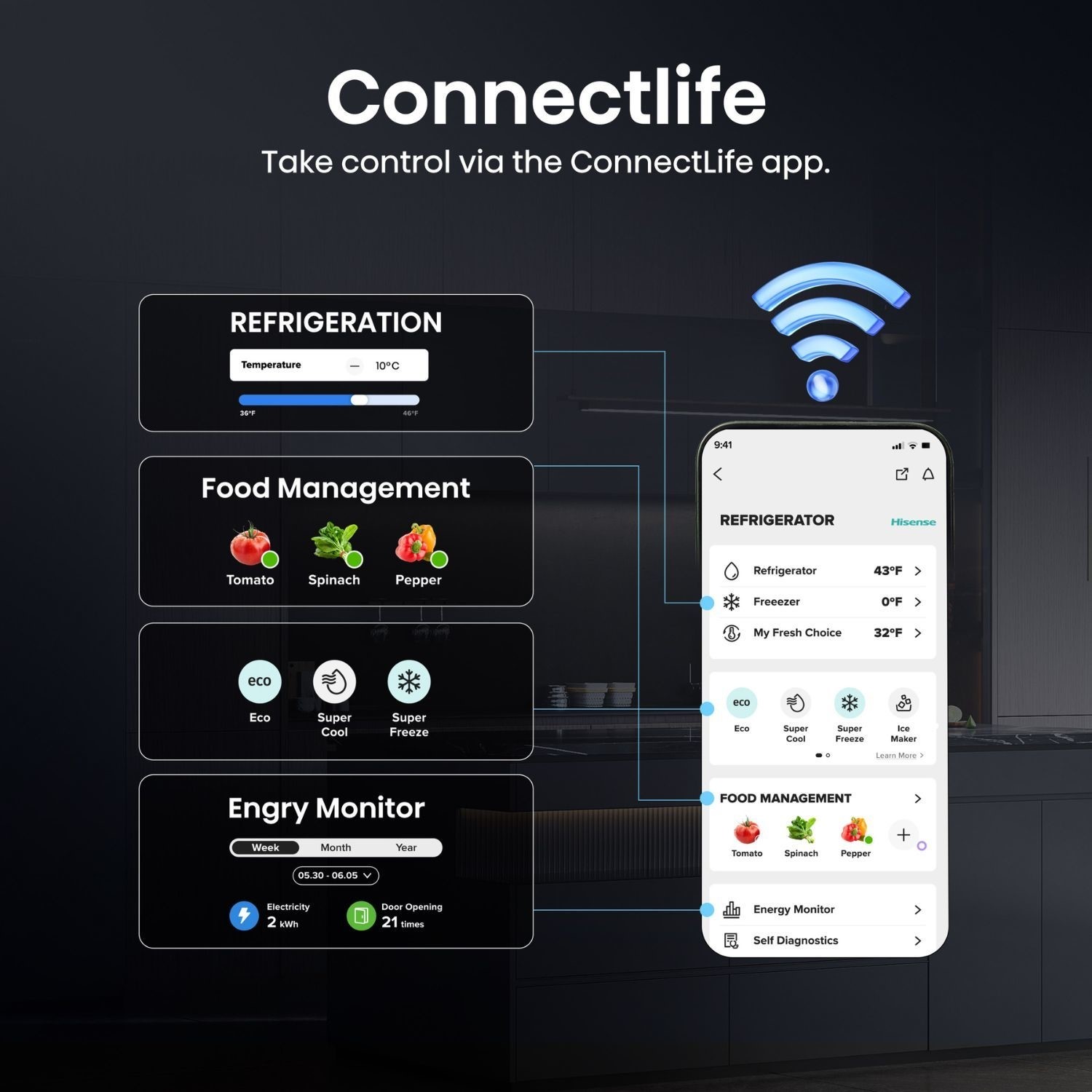 The Hisense RQ768N4GVE with Kitchen Fit seamlessly integrates into your kitchen with its minimal yet stylish aesthetic. Whilst design is key, our Kitchen Fit is so much more. Packed with existing Hisense Features and more! With only about 60cm in depth, our product is designed to fit in to almost any kitchen space, you don’t have to compromise thanks to the improved hinge design giving you over 100 degrees of door opening with only a 3mm gap around. With Wi-Fi connectivity, you can use the ConnectLIFE app to control your refrigerator to montior and set the temperature as well as food inventory lists.