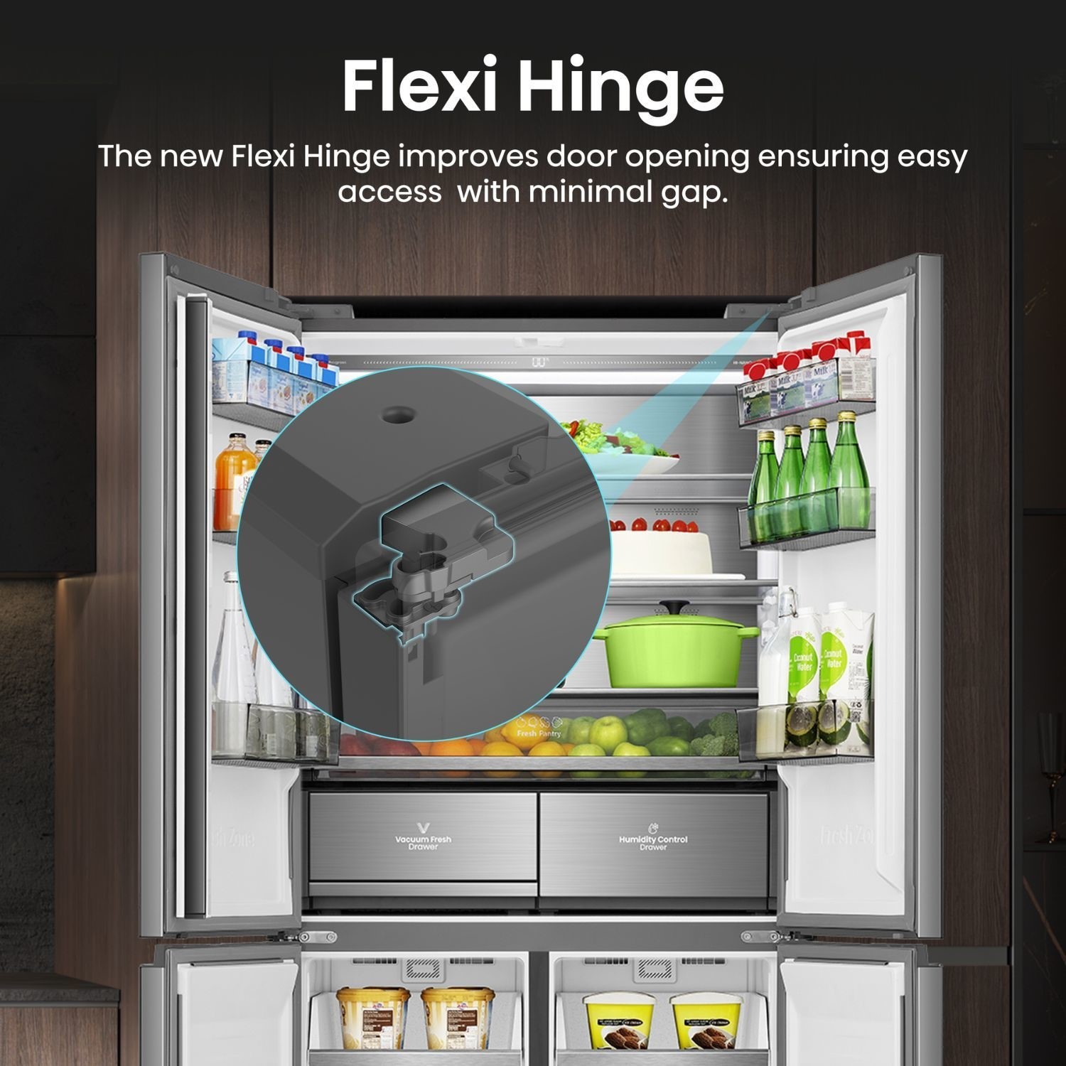 Hisense has always been seeking ways to bring more convenience to our customers’ lives. With our new Hinge technology, we manage to help you open the door to 103° even when it is slotted in, which makes it easier for you to grab your favorite foods inside the refrigerator.