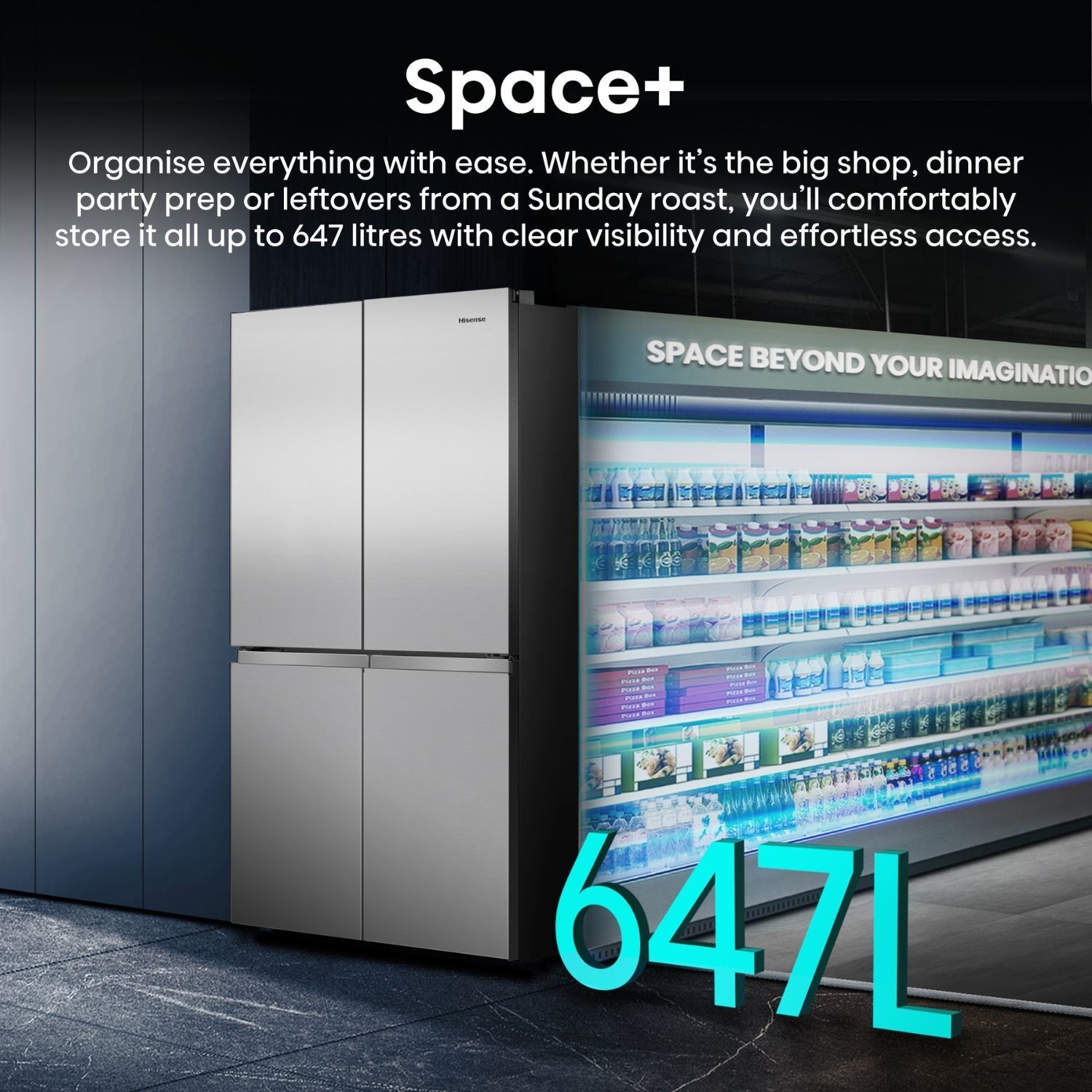 Introducing the New Hisense PureFlex. Welcome to the next generation of refrigeration. The new Hisense PureFlex range brings together cutting-edge technology and refined design, offering a premium kitchen centrepiece that performs as beautifully as it looks. The spacious 640-litre interior adapts effortlessly to your lifestyle. New split cantilever shelves and sliding trays offer unmatched storage flexibility, so you can organise your groceries your way, without compromise.