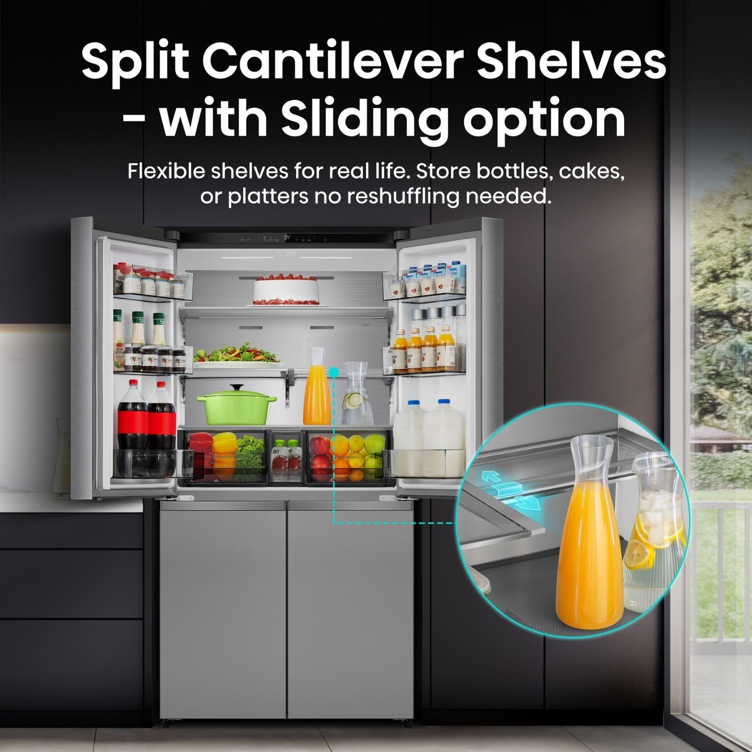Designed for ultimate flexibility, split cantilever shelves let you customise your fridge layout in seconds. Tall bottles, oversized platters, or stacked containers fit effortlessly thanks to adjustable shelving and a sliding section that creates space exactly where you need it. There’s no need to remove shelves or reshuffle items—everything adjusts smoothly to suit your groceries. It’s organisation made simple, intuitive, and frustration-free.