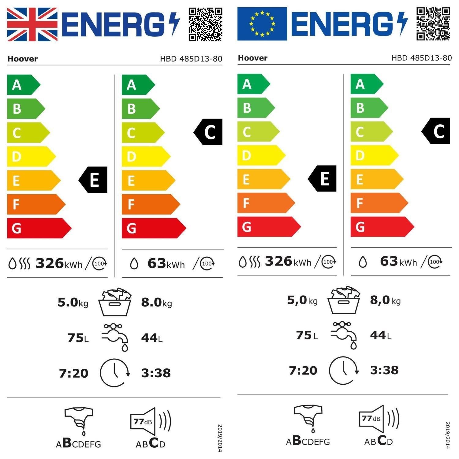 In compliance with the New Energy Label, this washer dryer is in C class using the washing cycle only, reducing consumption starting from 34% compared to a G class, saving energy and protecting the environment.
