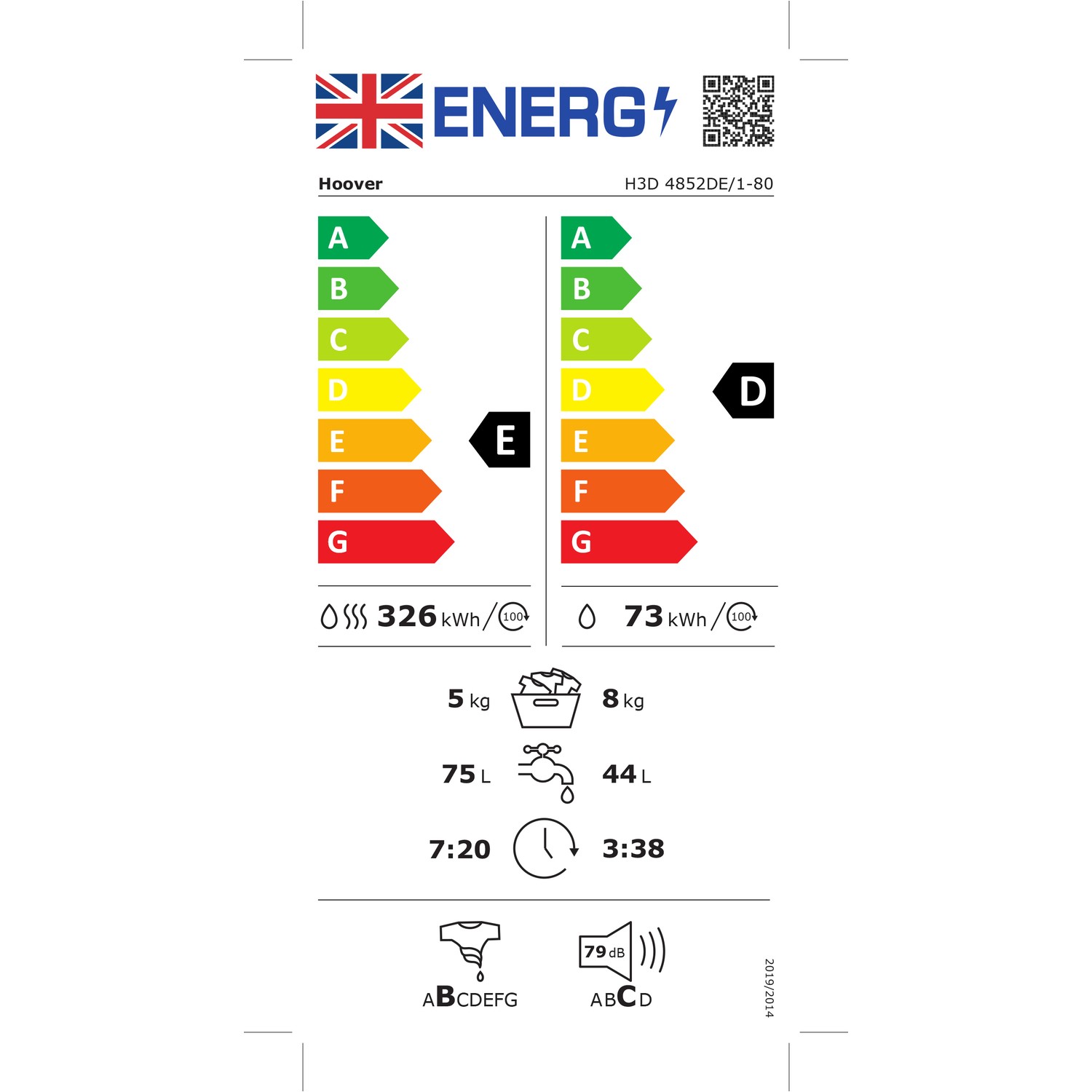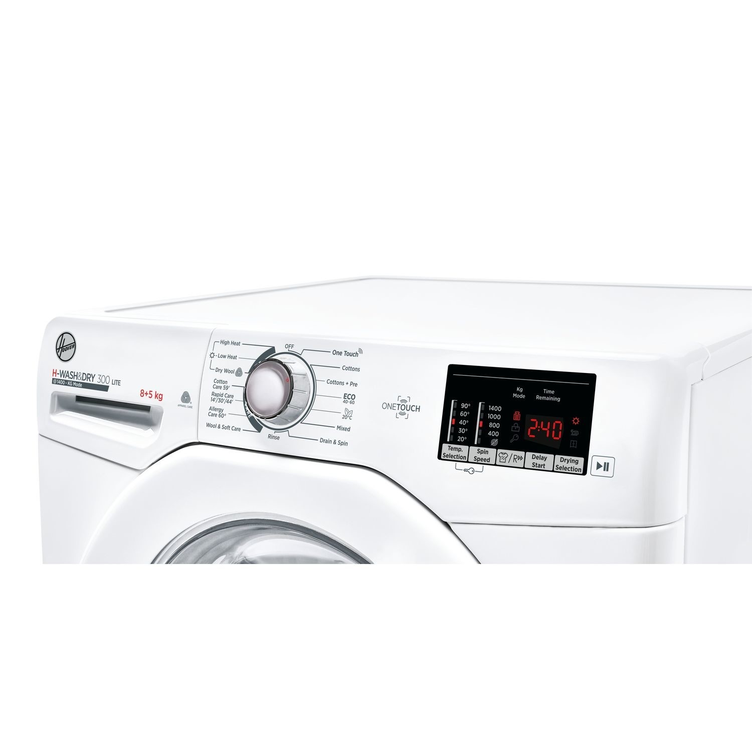 This Hoover washer dryer has an 8kg wash and a 5kg dry load capacity, as well as a 1400 spin speed. KG Mode will weigh the load during the first four minutes and adjusts the length of the programme and the water consumption accordingly. The clever Sensor Dry function allows you to choose the level of dryness you require from three options, and the machine will automatically switch off when it senses that this level has been reached, saving you time and energy. You can also use the Timed Drying function, which will let you set the cycle for a specific amount of time. NFC technology allows you to connect to the machine via an app on smartphones, so you can choose and monitor cycles and run diagnostic checks.