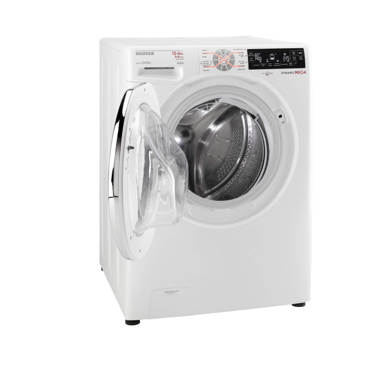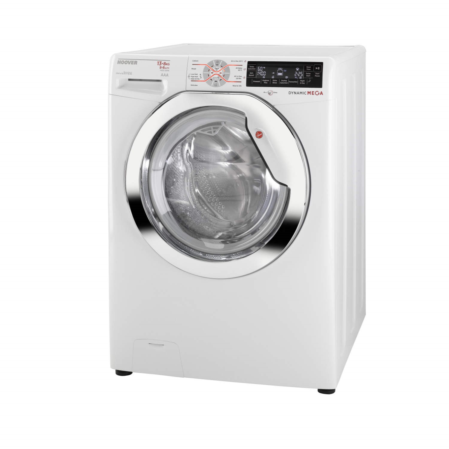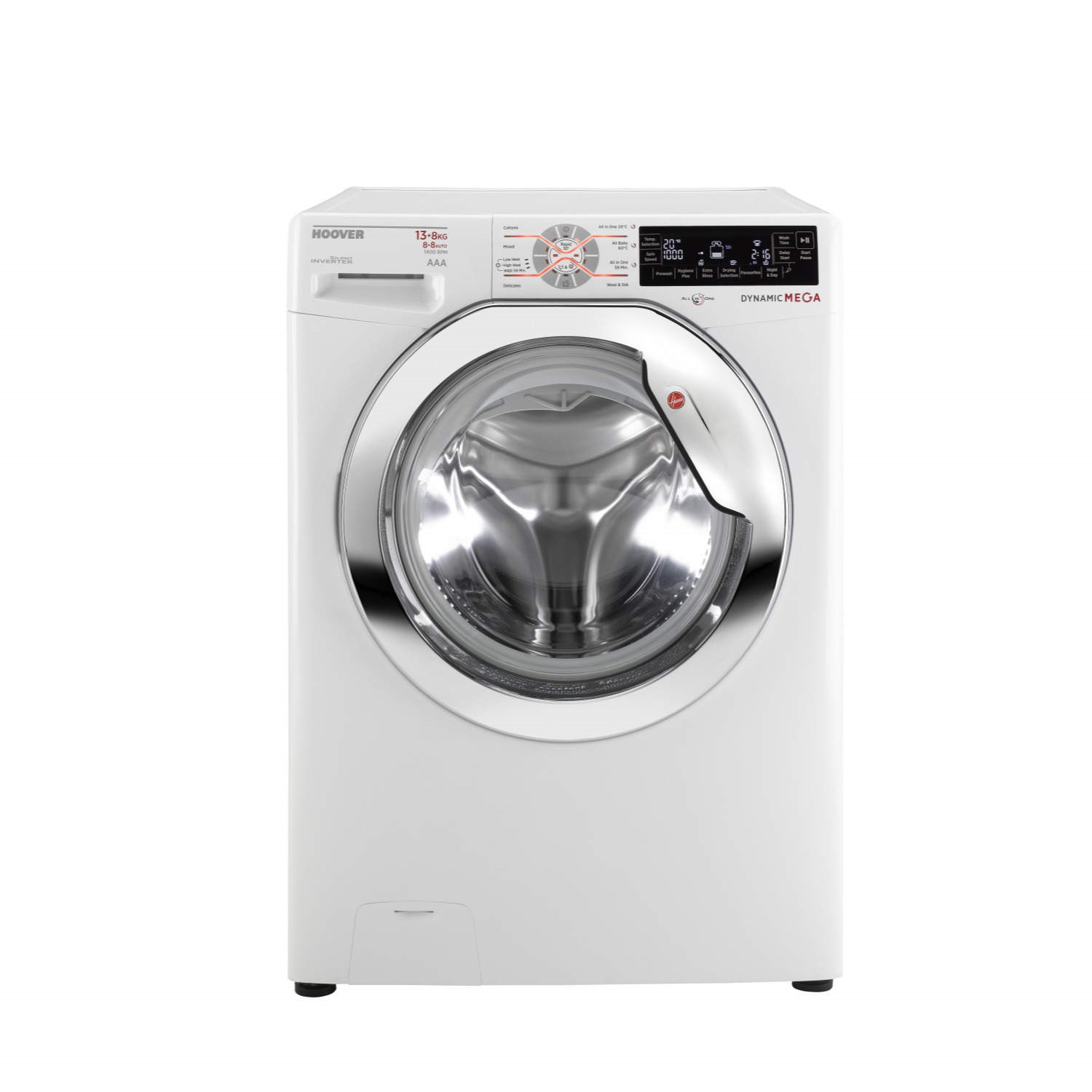 Hoover's mega load 13kg wash + 8kg dry capacity washer dryer is the largest domestic machine in the market! The Dynamic Next range of advanced, easy to use washer dryers combines all the features of a Hoover washing machine with the convenience of a dryer and offers a choice of practical, large capacity laundry solutions. All models offer spin options of up to 1600rpm plus all the advanced features of our Dynamic Next washing machines, including the Intelligent Wash System and sensor dry technology to give you the best wash & dry ever with the minimum of effort.