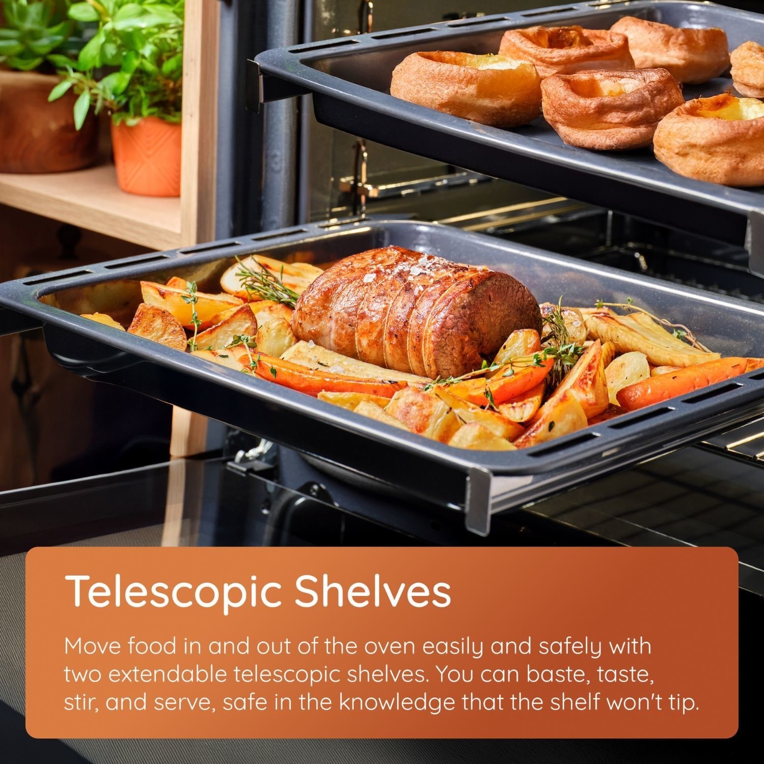 - Telescopic Shelves - Taste, baste, stir, and serve with ease, without tipping the shelf.