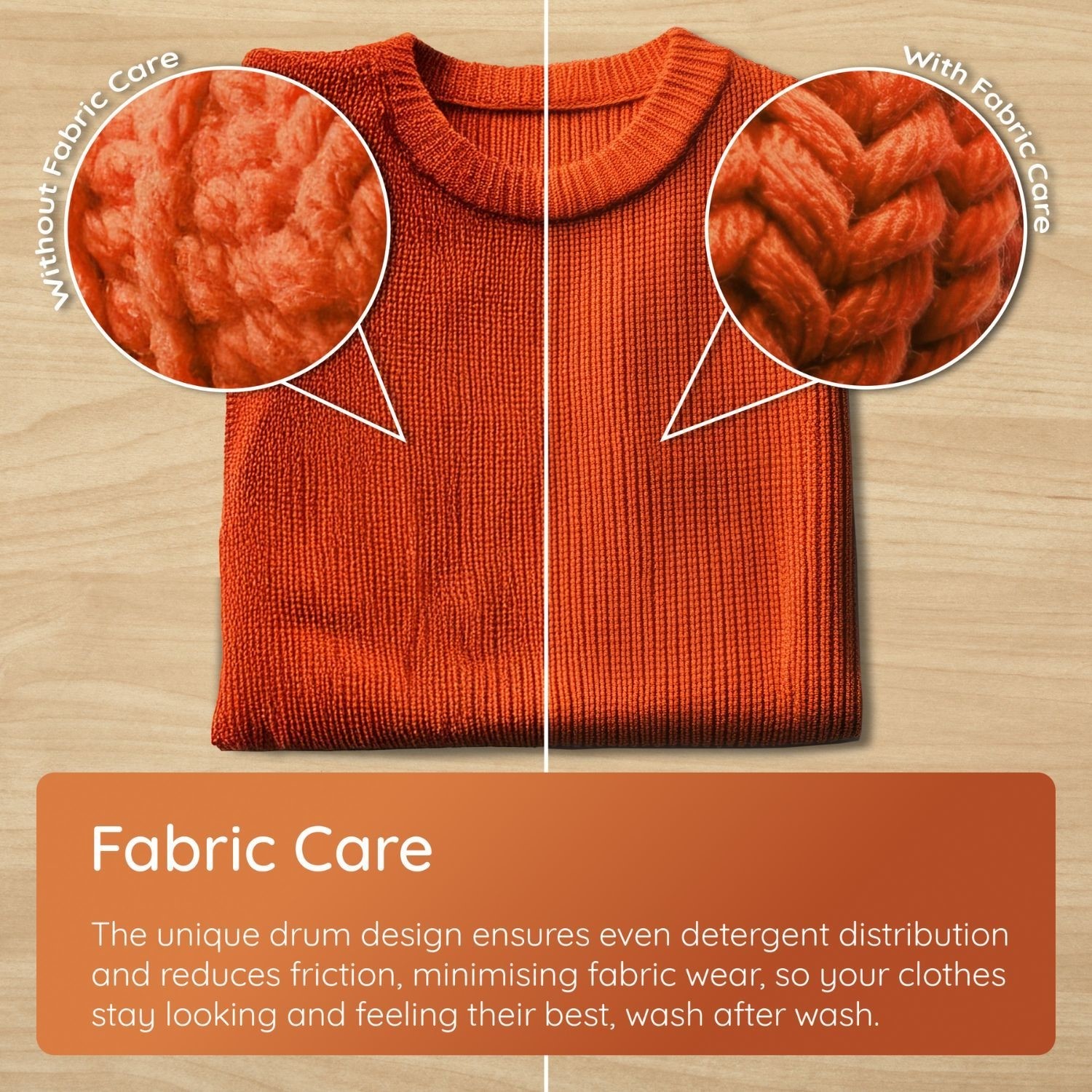Fabric Care technology is twice as gentle on your laundry, helping your favourite clothes last even longer. The unique drum design ensures even detergent distribution and reduces friction, minimising fabric wear, so your clothes stay looking and feeling their best, wash after wash. Based on internal testing of the Cotton 40° programme, comparing the new Fabric Care model to the previous model without Fabric Care technology.