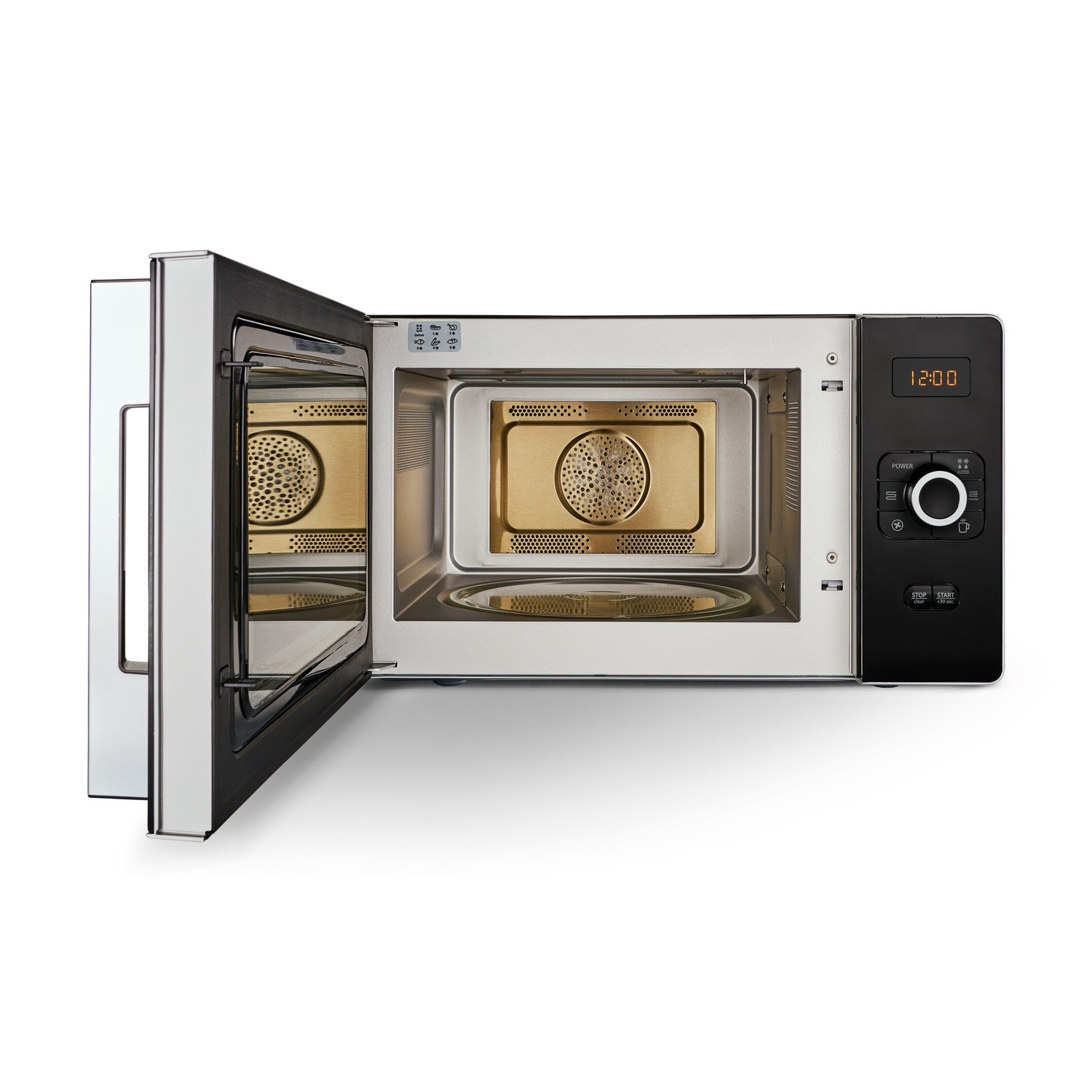 A powerful fan distributes heat evenly, delivering the same results expected from a traditional oven, so you can bake & roast in your microwave in much less time.