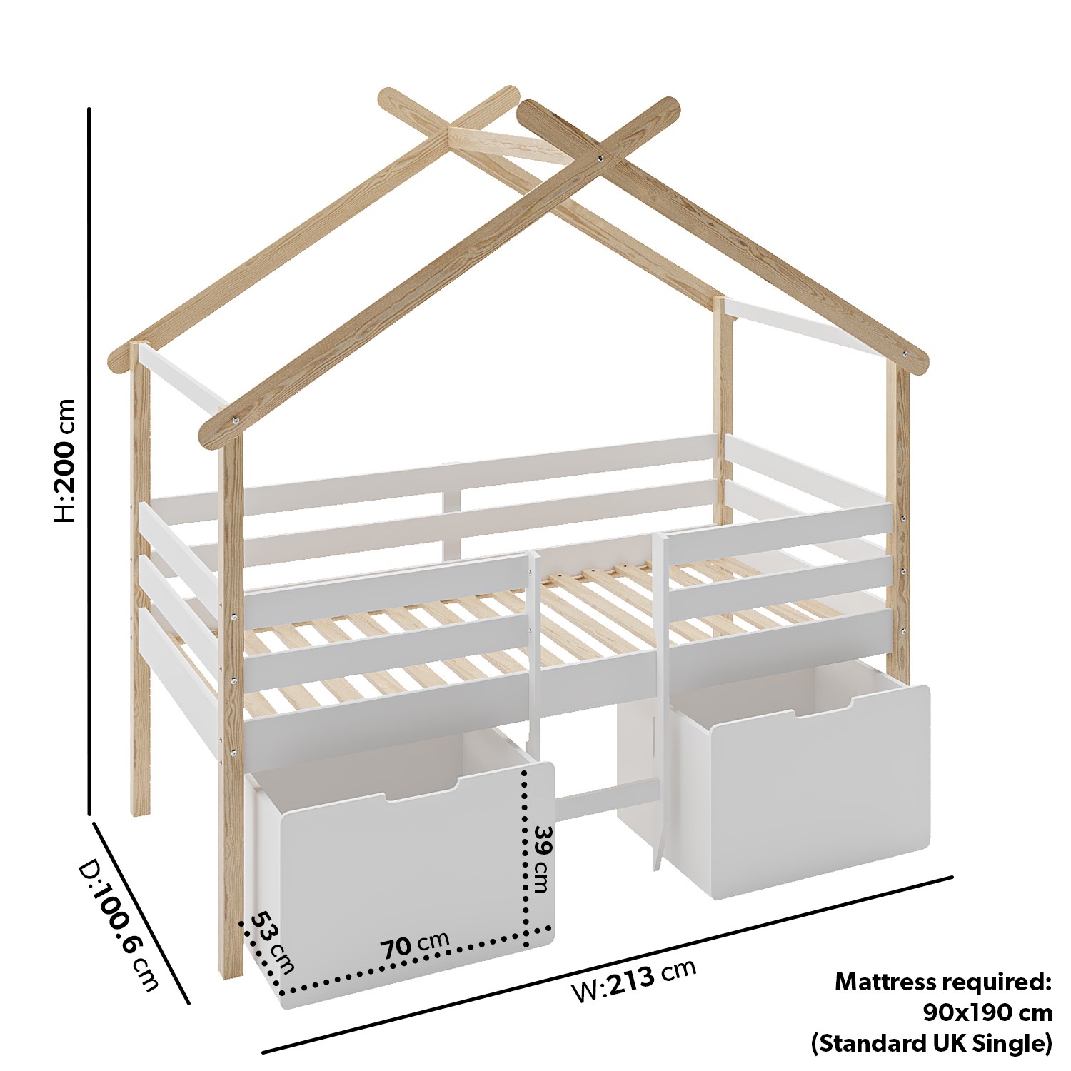 The Mylo cabin bed features a fun and cosy house design that's guaranteed to get your little one enjoying bedtime. The modern white and pine finish matches any kids' bedroom decor. The 2 drawers are perfect for storing toys or even clothes, and they feature cut-out handles, ideal for little hands. Complete the look with the matching Mylo furniture collection.